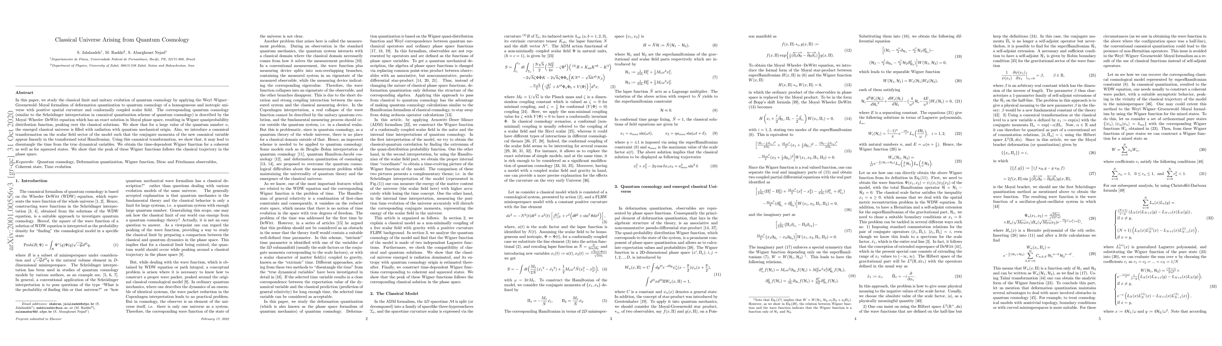 This paper explores the classical limit of quantum cosmology using the Weyl-Wigner-Groenewold-Moyal formalism, demonstrating that the classical universe emerges from quantum mechanics for large quantum numbers, filled with radiation. It introduces a canonical transformation to disentangle time from dynamical variables and shows that the Wigner function peaks follow classical trajectories.