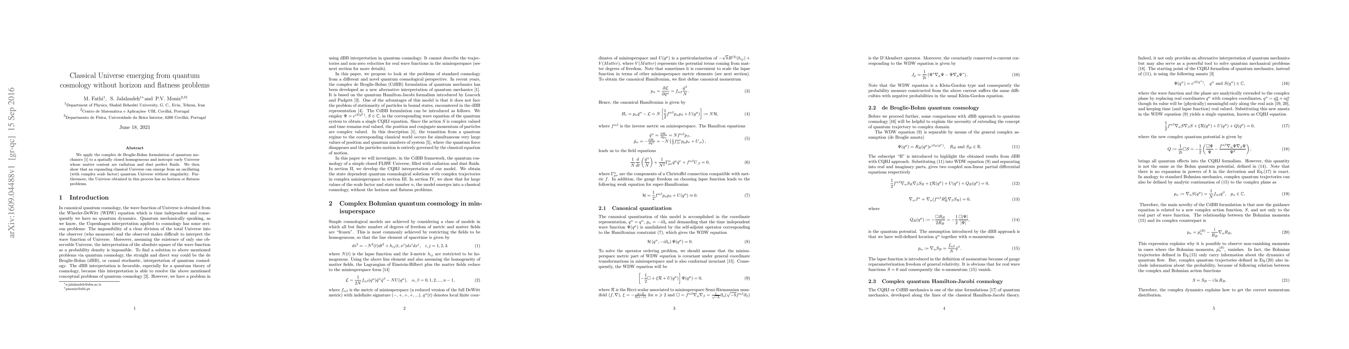 This paper demonstrates that a classical expanding universe can emerge from a quantum cosmology framework using the complex de Broglie-Bohm formulation, avoiding both horizon and flatness problems, and without encountering a singularity. The model considers a spatially closed early universe filled with radiation and dust.