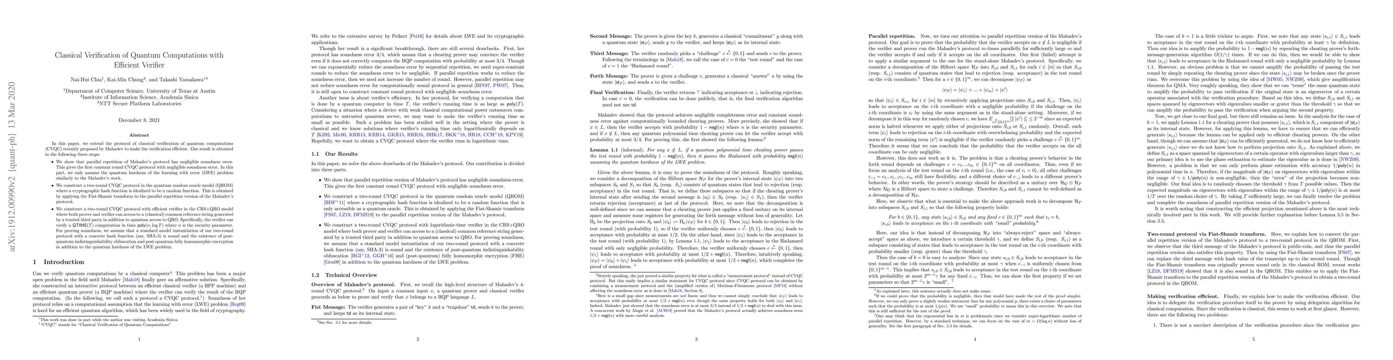This paper presents an efficient classical verification protocol for quantum computations, extending Mahadev's CVQC protocol. It achieves negligible soundness error through parallel repetition and constructs a two-round protocol in the quantum random oracle model, culminating in a two-round protocol with an efficient verifier in the CRS+QRO model.
