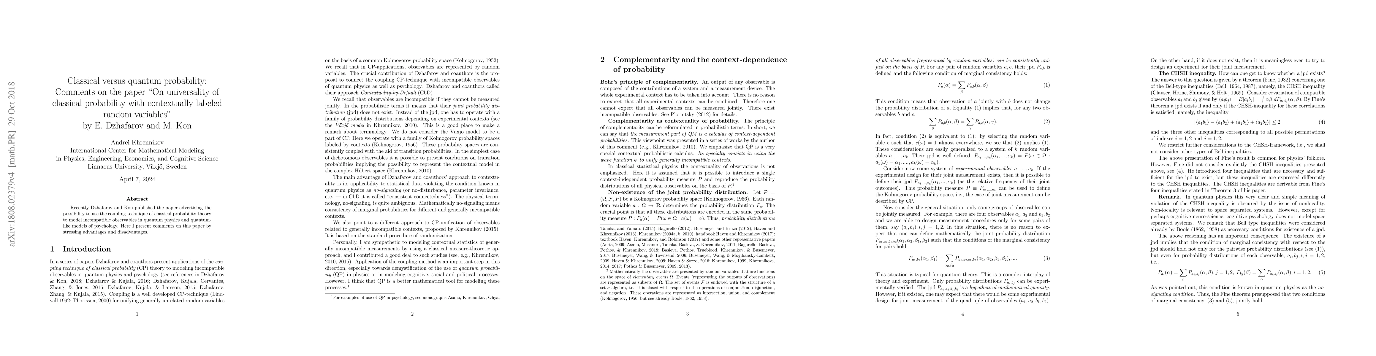 Recently Dzhafarov and Kon published the paper advertising the possibility to use the coupling technique of classical probability theory to model incompatible observables in quantum physics and quantum-like models of psychology. Here I present comments on this paper by stressing advantages and disadvantages.
