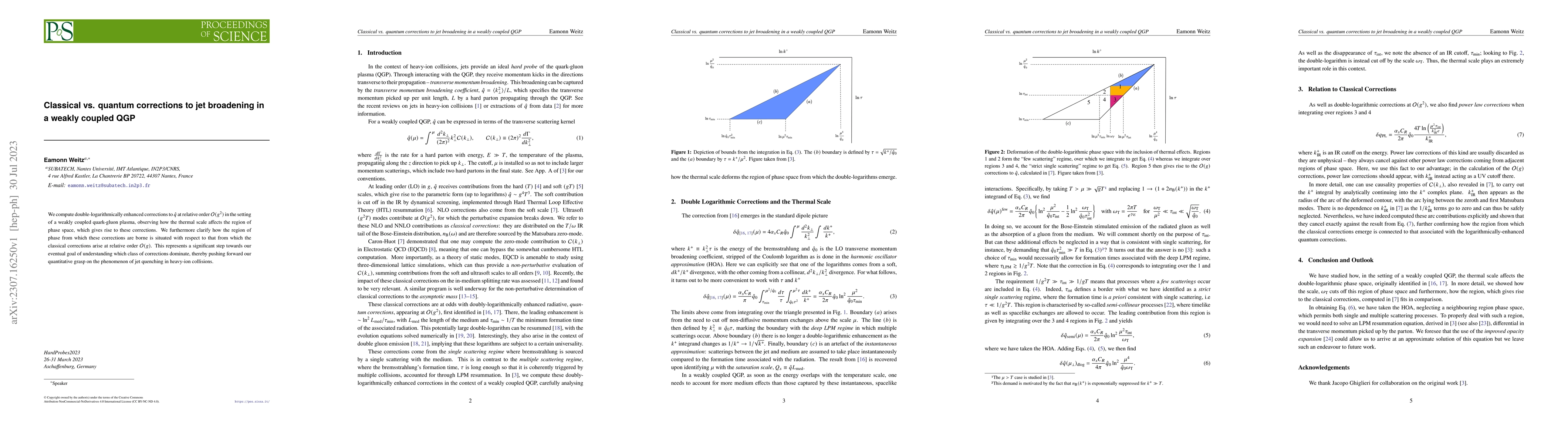 We compute double-logarithmically enhanced corrections to $\widehat{q}$ at relative order $O(g^2)$ in the setting of a weakly coupled quark-gluon plasma, observing how the thermal scale affects the region of phase space, which gives rise to these corrections. We furthermore clarify how the region of phase from which these corrections are borne is situated with respect to that from which the classical corrections arise at relative order $O(g)$. This represents a significant step towards our eventual goal of understanding which class of corrections dominate, thereby pushing forward our quantitative grasp on the phenomenon of jet quenching in heavy-ion collisions.