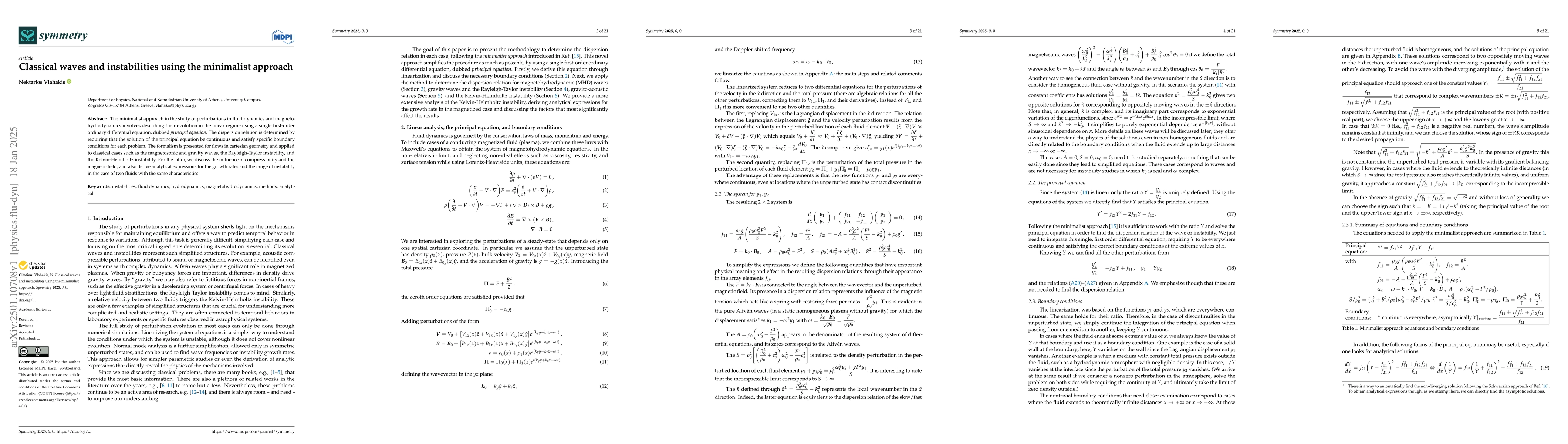The paper employs a minimalist approach to study perturbations in fluid dynamics and magnetohydrodynamics, utilizing a single first-order ordinary differential equation (principal equation) to describe the evolution in the linear regime. The dispersion relation is determined by ensuring the continuity of the solution and satisfying specific boundary conditions for each problem.