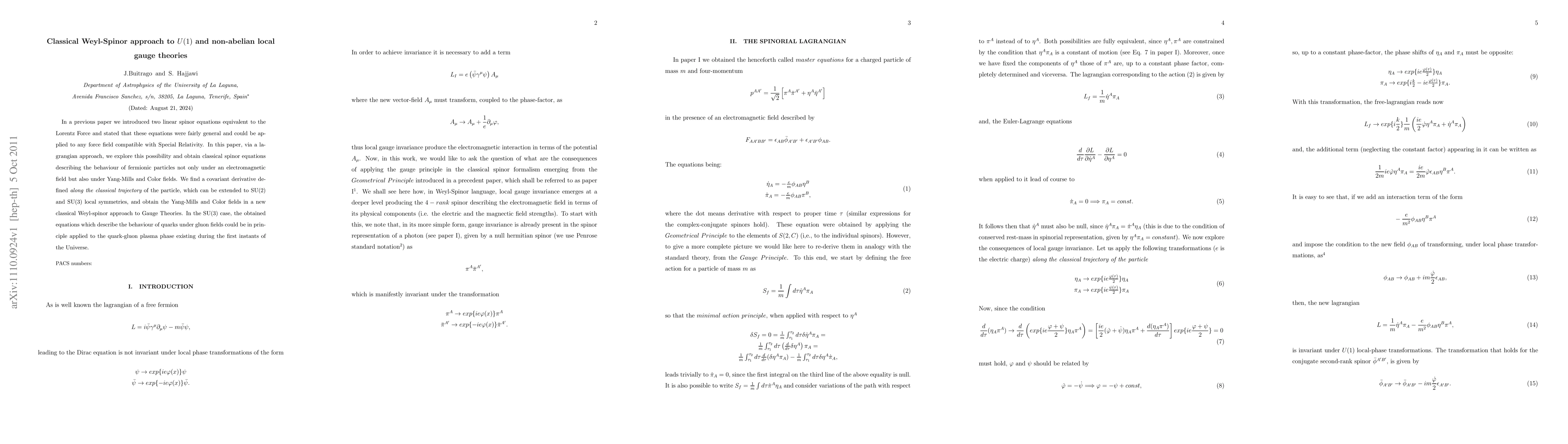 This paper extends classical Weyl-spinor equations to describe fermionic particles under electromagnetic, Yang-Mills, and Color fields using a Lagrangian approach. It introduces a covariant derivative applicable to SU(2) and SU(3) symmetries, potentially offering insights into quark-gluon plasma dynamics in the early Universe.