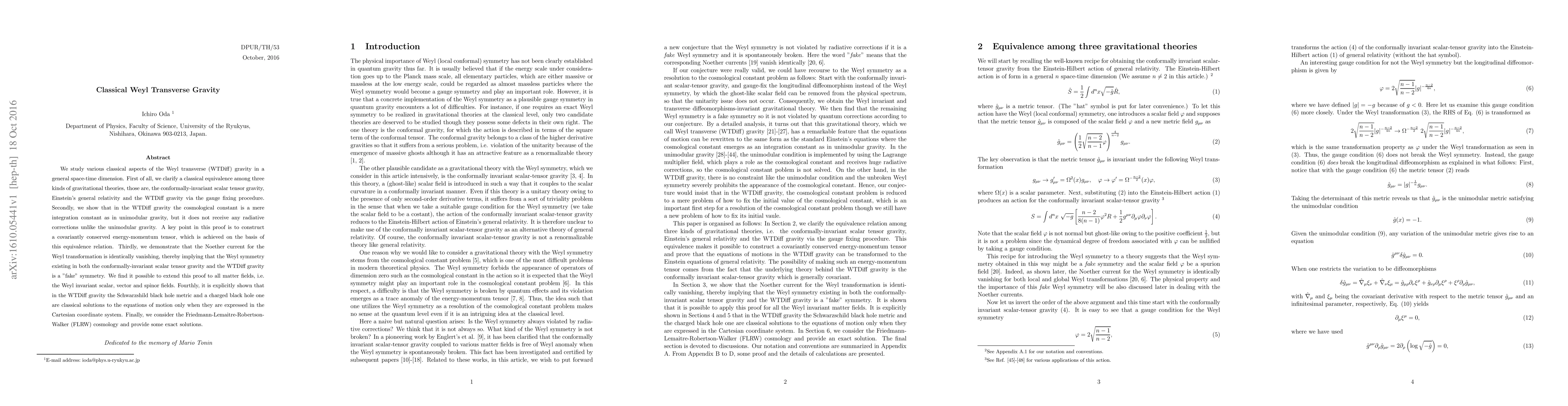 We study various classical aspects of the Weyl transverse (WTDiff) gravity in a general space-time dimension. First of all, we clarify a classical equivalence among three kinds of gravitational theories, those are, the conformally-invariant scalar tensor gravity, Einstein's general relativity and the WTDiff gravity via the gauge fixing procedure. Secondly, we show that in the WTDiff gravity the cosmological constant is a mere integration constant as in unimodular gravity, but it does not receive any radiative corrections unlike the unimodular gravity. A key point in this proof is to construct a covariantly conserved energy-momentum tensor, which is achieved on the basis of this equivalence relation. Thirdly, we demonstrate that the Noether current for the Weyl transformation is identically vanishing, thereby implying that the Weyl symmetry existing in both the conformally-invariant scalar tensor gravity and the WTDiff gravity is a "fake" symmetry. We find it possible to extend this proof to all matter fields, i.e. the Weyl invariant scalar, vector and spinor fields. Fourthly, it is explicitly shown that in the WTDiff gravity the Schwarzshild black hole metric and a charged black hole one are classical solutions to the equations of motion only when they are expressed in the Cartesian coordinate system. Finally, we consider the Friedmann-Lemaitre-Robertson-Walker (FLRW) cosmology and provide some exact solutions.