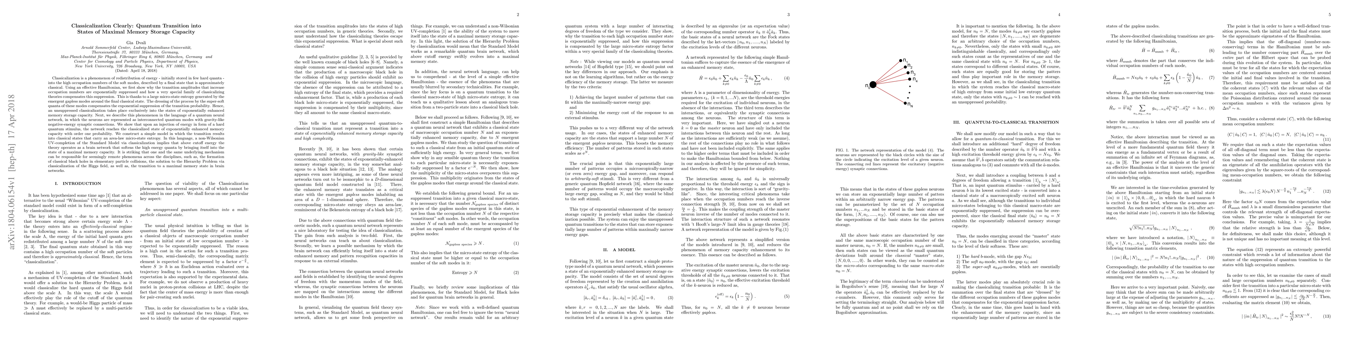 Classicalization is a phenomenon of redistribution of energy - initially stored in few hard quanta - into the high occupation numbers of the soft modes, described by a final state that is approximately classical. Using an effective Hamiltonian, we first show why the transition amplitudes that increase occupation numbers are exponentially suppressed and how a very special family of classicalizing theories compensates this suppression. This is thanks to a large micro-state entropy generated by the emergent gapless modes around the final classical state. The dressing of the process by the super-soft quanta of these modes compensates the exponential suppression of the transition probability. Hence, an unsuppressed classicalization takes place exclusively into the states of exponentially enhanced memory storage capacity. Next, we describe this phenomenon in the language of a quantum neural network, in which the neurons are represented as interconnected quantum modes with gravity-like negative-energy synaptic connections. We show that upon an injection of energy in form of a hard quantum stimulus, the network reaches the classicalized state of exponentially enhanced memory capacity with order one probability. We construct a simple model in which the transition results into classical states that carry an area-law micro-state entropy. In this language, a non-Wilsonian UV-completion of the Standard Model via classicalization implies that above cutoff energy the theory operates as a brain network that softens the high energy quanta by bringing itself into the state of a maximal memory capacity. A similar interpretation applies to black hole formation in particle collision.