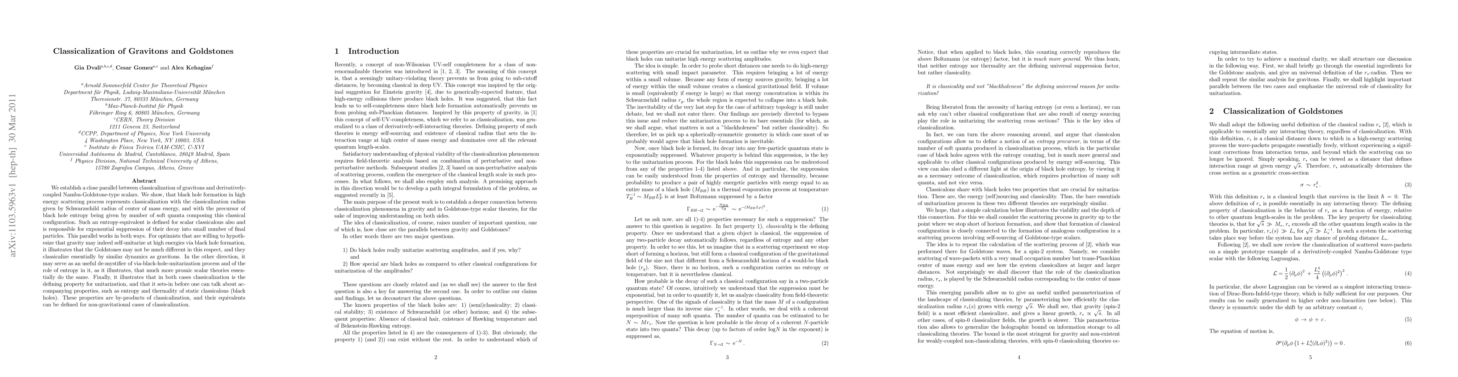 The paper establishes a parallel between graviton classicalization and Goldstone boson classicalization in high-energy scattering processes, highlighting the role of entropy in unitarization and classicalization.