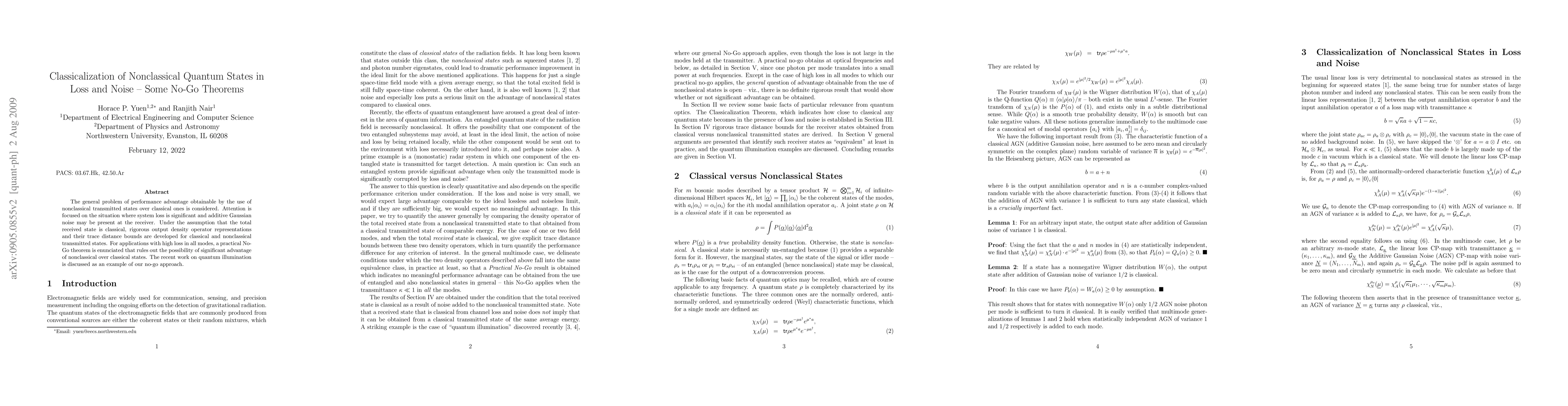 The general problem of performance advantage obtainable by the use of nonclassical transmitted states over classical ones is considered. Attention is focused on the situation where system loss is significant and additive Gaussian noise may be present at the receiver. Under the assumption that the total received state is classical, rigorous output density operator representations and their trace distance bounds are developed for classical and nonclassical transmitted states. For applications with high loss in all modes, a practical No-Go theorem is enunciated that rules out the possibility of significant advantage of nonclassical over classical states. The recent work on quantum illumination is discussed as an example of our no-go approach.