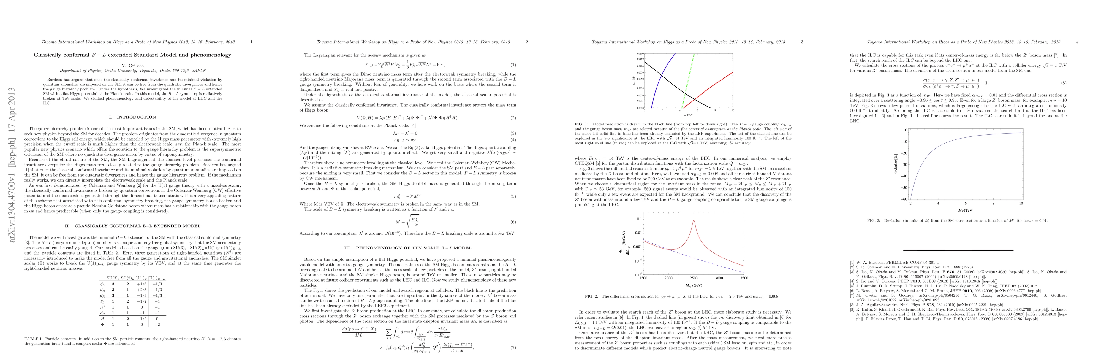 This paper explores a classically conformally invariant B-L extended Standard Model that addresses the gauge hierarchy problem by minimal quantum anomaly violation. It investigates the model's phenomenology and its potential detectability at the LHC and ILC.