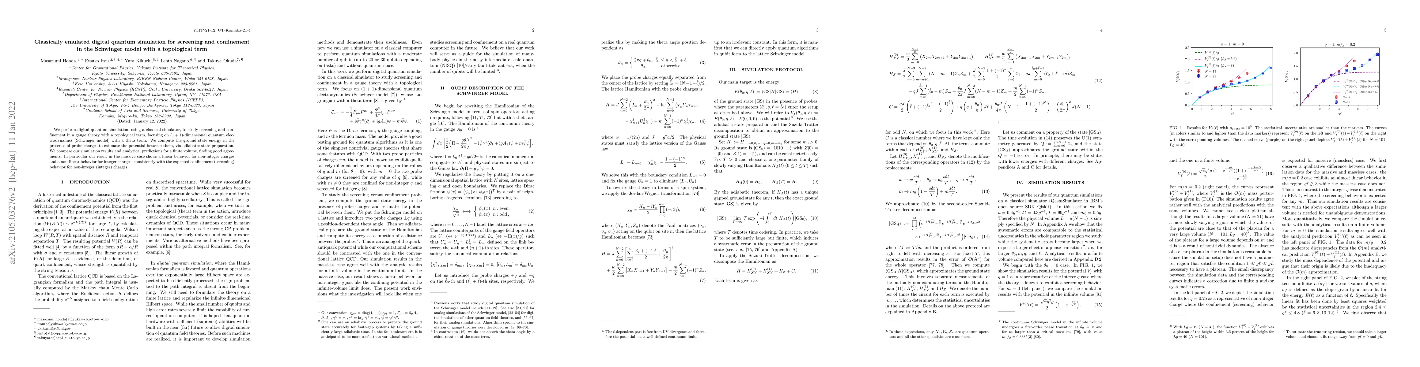 We perform digital quantum simulation, using a classical simulator, to study screening and confinement in a gauge theory with a topological term, focusing on ($1+1$)-dimensional quantum electrodynamics (Schwinger model) with a theta term. We compute the ground state energy in the presence of probe charges to estimate the potential between them, via adiabatic state preparation. We compare our simulation results and analytical predictions for a finite volume, finding good agreements. In particular our result in the massive case shows a linear behavior for non-integer charges and a non-linear behavior for integer charges, consistently with the expected confinement (screening) behavior for non-integer (integer) charges.