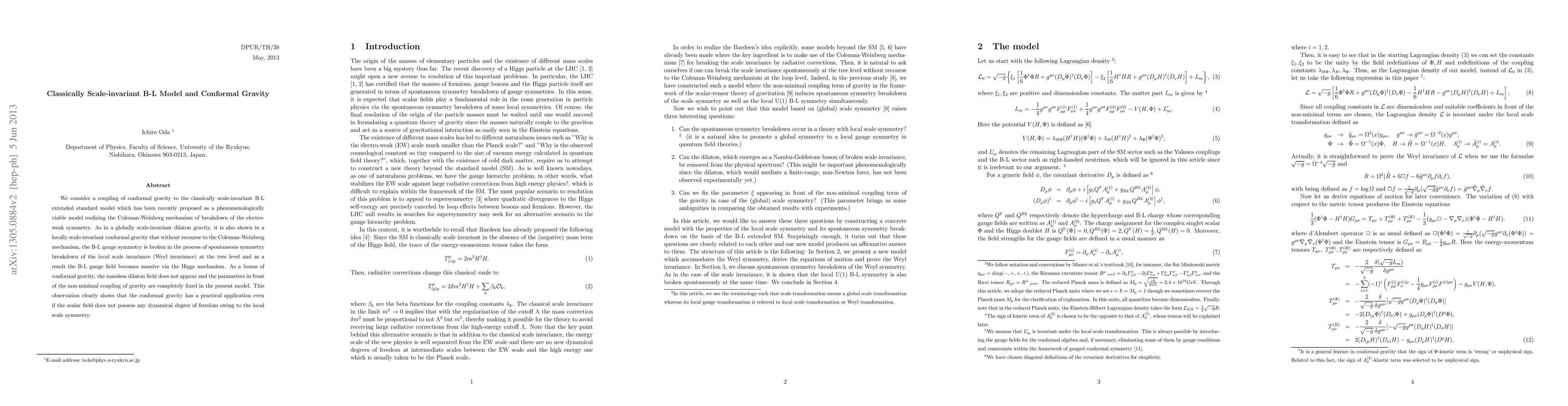 This paper explores the coupling of conformal gravity to a scale-invariant B-L extended standard model, demonstrating that spontaneous symmetry breakdown of local scale invariance leads to B-L gauge symmetry breaking and mass generation for the B-L gauge field via the Higgs mechanism, without requiring the Coleman-Weinberg mechanism. Conformal gravity uniquely avoids the appearance of a massless dilaton field and fixes the parameters of gravity's non-minimal coupling.