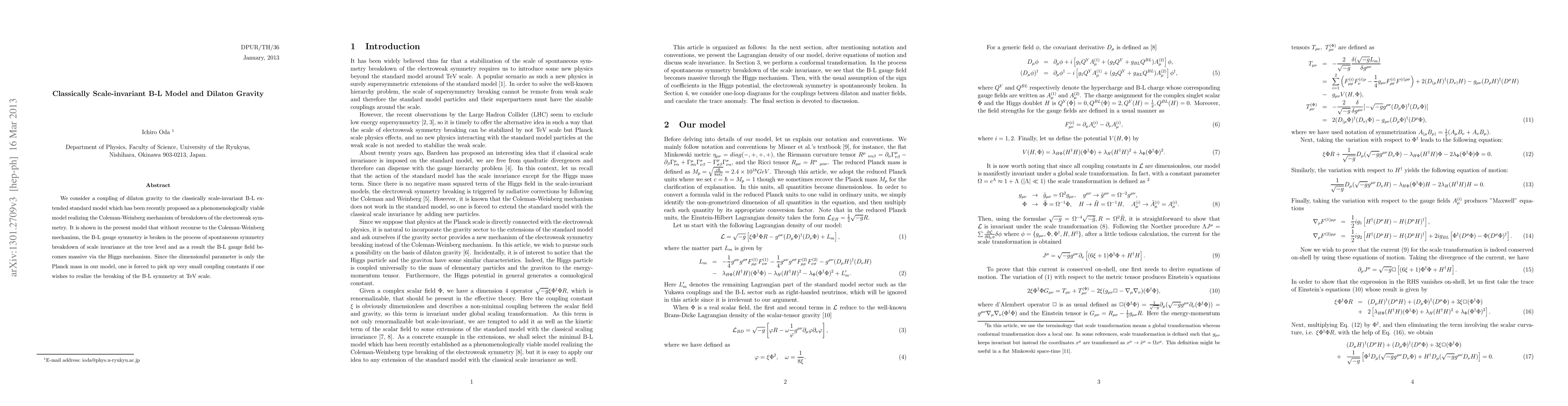 This paper explores the coupling of dilaton gravity to a classically scale-invariant B-L extended standard model, demonstrating that B-L gauge symmetry can break spontaneously without the Coleman-Weinberg mechanism, resulting in a massive B-L gauge field via the Higgs mechanism. Small coupling constants are required to achieve B-L symmetry breaking at the TeV scale.