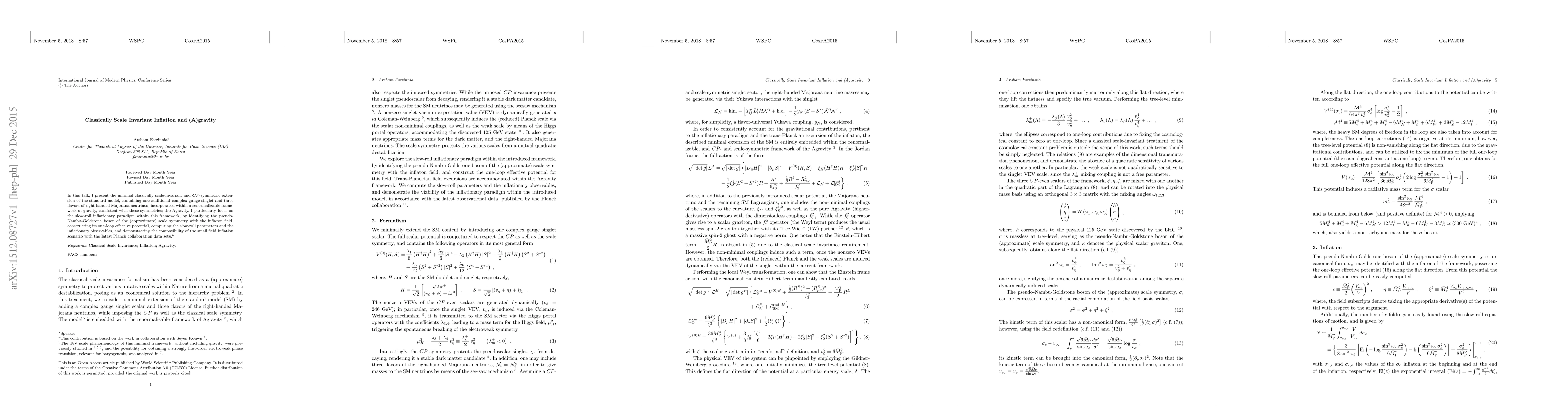 In this talk, I present the minimal classically scale-invariant and $CP$-symmetric extension of the standard model, containing one additional complex gauge singlet and three flavors of right-handed Majorana neutrinos, incorporated within a renormalizable framework of gravity, consistent with these symmetries; the Agravity. I particularly focus on the slow-roll inflationary paradigm within this framework, by identifying the pseudo-Nambu-Goldstone boson of the (approximate) scale symmetry with the inflaton field, constructing its one-loop effective potential, computing the slow-roll parameters and the inflationary observables, and demonstrating the compatibility of the small field inflation scenario with the latest Planck collaboration data sets.