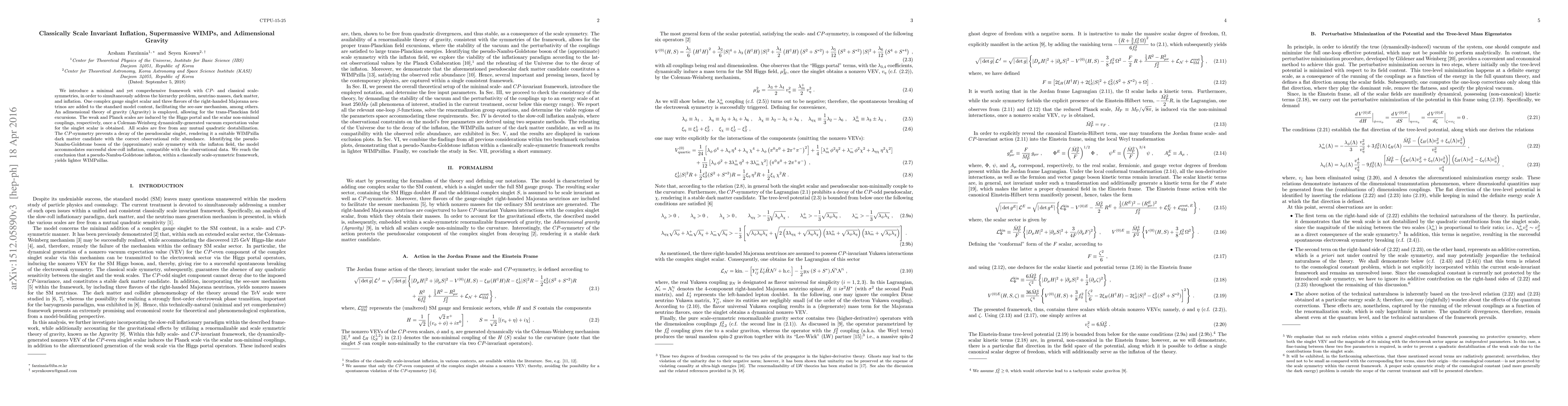 This paper proposes a framework with $CP$- and classical scale-symmetries to address the hierarchy problem, neutrino masses, dark matter, and inflation. It introduces a new scalar and right-handed neutrinos to the standard model, utilizes Agravity for trans-Planckian inflation, and identifies a pseudoscalar singlet as a WIMPzilla dark matter candidate.