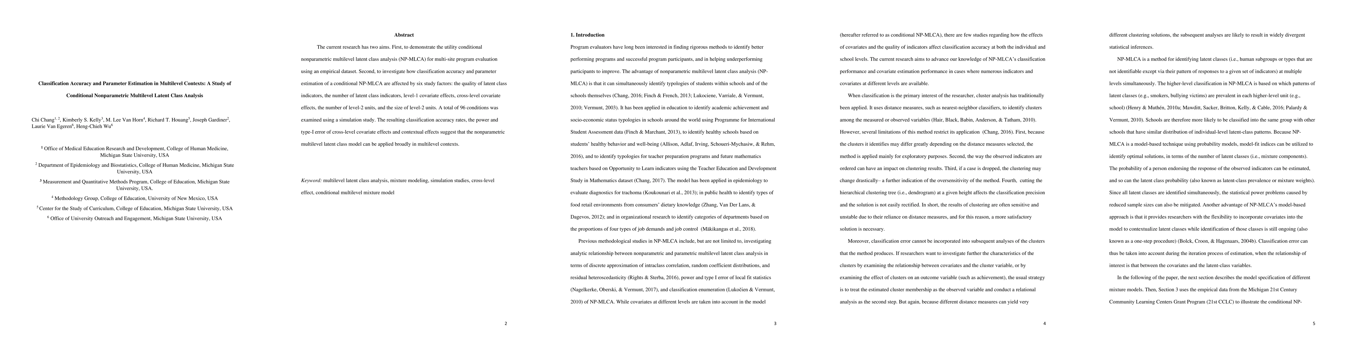 The current research has two aims. First, to demonstrate the utility conditional nonparametric multilevel latent class analysis (NP-MLCA) for multi-site program evaluation using an empirical dataset. Second, to investigate how classification accuracy and parameter estimation of a conditional NP-MLCA are affected by six study factors: the quality of latent class indicators, the number of latent class indicators, level-1 covariate effects, cross-level covariate effects, the number of level-2 units, and the size of level-2 units. A total of 96 conditions was examined using a simulation study. The resulting classification accuracy rates, the power and type-I error of cross-level covariate effects and contextual effects suggest that the nonparametric multilevel latent class model can be applied broadly in multilevel contexts.