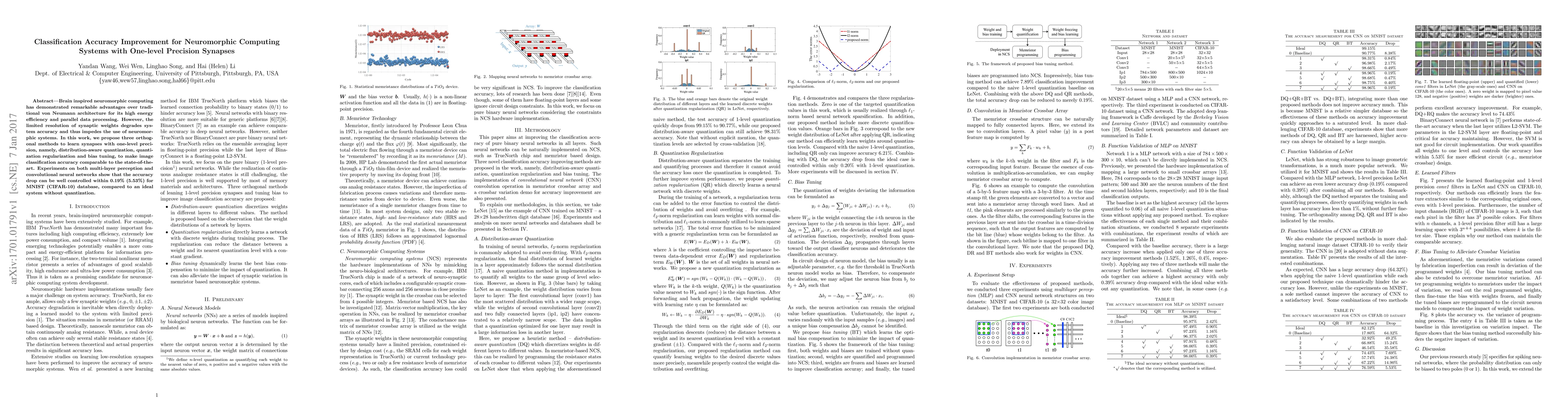 Researchers propose three methods to improve image classification accuracy in neuromorphic computing systems with one-level precision synapses, achieving an accuracy comparable to state-of-the-art systems within a 0.19% drop.