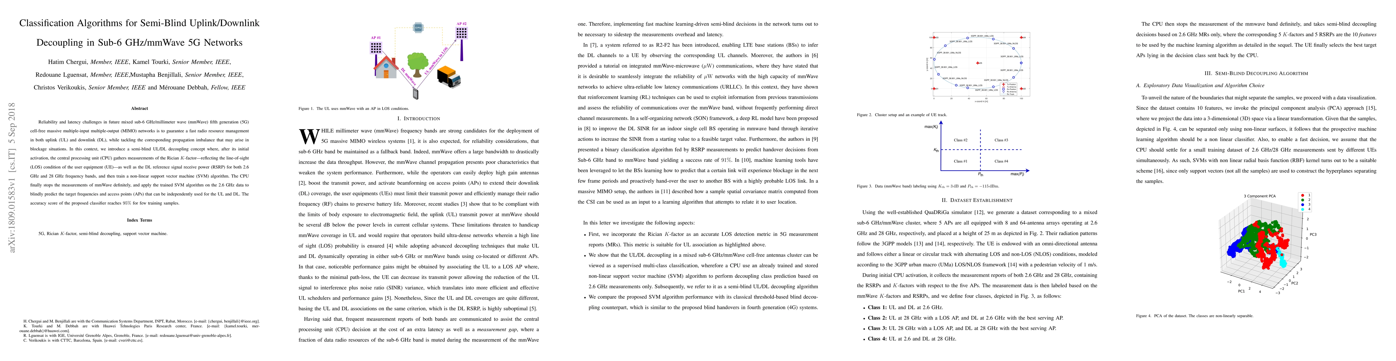 This paper proposes a semi-blind uplink/downlink decoupling method for 5G networks using sub-6 GHz and mmWave frequencies. A non-linear SVM classifier trained on Rician $K$-factor and DL reference signal receive power achieves $95\%$ accuracy in predicting independent frequencies and access points for uplink and downlink.