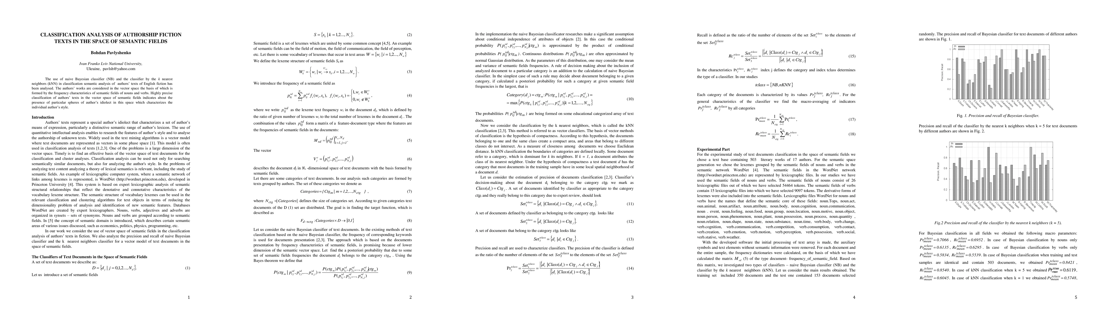 This paper analyzes the use of naive Bayesian classifiers and k-nearest neighbors for classifying English fiction texts based on the semantic fields of nouns and verbs. The results show precise author classification, indicating distinct author-specific stylistic features in the semantic field space.
