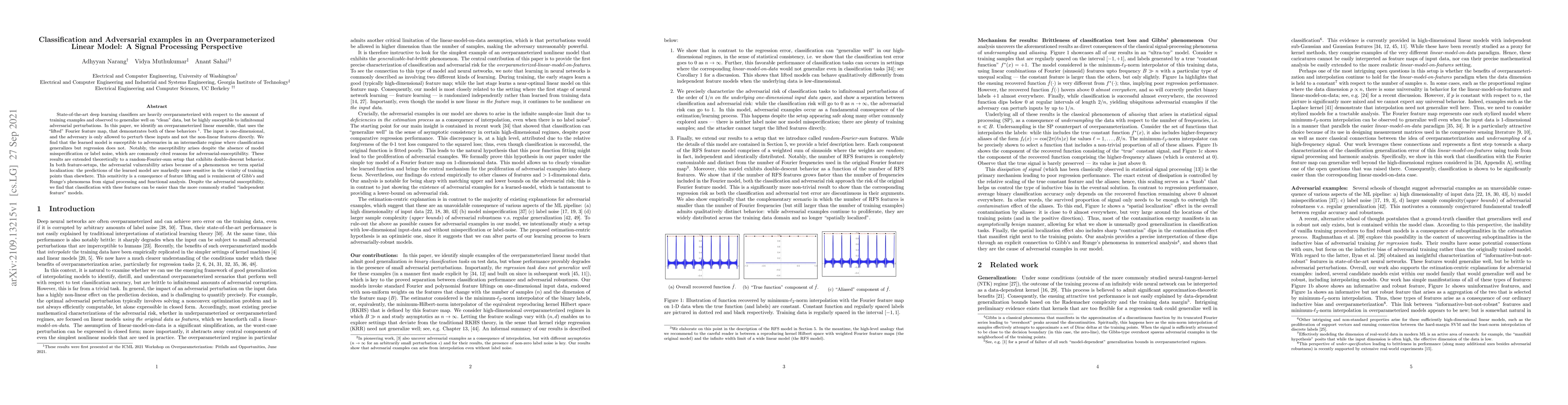 State-of-the-art deep learning classifiers are heavily overparameterized with respect to the amount of training examples and observed to generalize well on "clean" data, but be highly susceptible to infinitesmal adversarial perturbations. In this paper, we identify an overparameterized linear ensemble, that uses the "lifted" Fourier feature map, that demonstrates both of these behaviors. The input is one-dimensional, and the adversary is only allowed to perturb these inputs and not the non-linear features directly. We find that the learned model is susceptible to adversaries in an intermediate regime where classification generalizes but regression does not. Notably, the susceptibility arises despite the absence of model mis-specification or label noise, which are commonly cited reasons for adversarial-susceptibility. These results are extended theoretically to a random-Fourier-sum setup that exhibits double-descent behavior. In both feature-setups, the adversarial vulnerability arises because of a phenomenon we term spatial localization: the predictions of the learned model are markedly more sensitive in the vicinity of training points than elsewhere. This sensitivity is a consequence of feature lifting and is reminiscent of Gibb's and Runge's phenomena from signal processing and functional analysis. Despite the adversarial susceptibility, we find that classification with these features can be easier than the more commonly studied "independent feature" models.