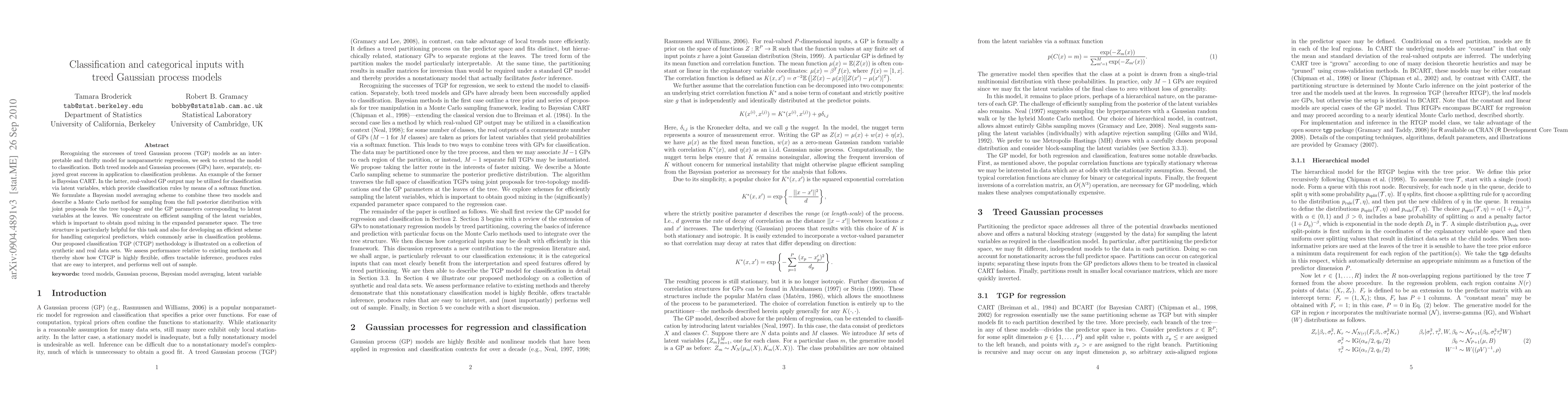 Recognizing the successes of treed Gaussian process (TGP) models as an interpretable and thrifty model for nonparametric regression, we seek to extend the model to classification. Both treed models and Gaussian processes (GPs) have, separately, enjoyed great success in application to classification problems. An example of the former is Bayesian CART. In the latter, real-valued GP output may be utilized for classification via latent variables, which provide classification rules by means of a softmax function. We formulate a Bayesian model averaging scheme to combine these two models and describe a Monte Carlo method for sampling from the full posterior distribution with joint proposals for the tree topology and the GP parameters corresponding to latent variables at the leaves. We concentrate on efficient sampling of the latent variables, which is important to obtain good mixing in the expanded parameter space. The tree structure is particularly helpful for this task and also for developing an efficient scheme for handling categorical predictors, which commonly arise in classification problems. Our proposed classification TGP (CTGP) methodology is illustrated on a collection of synthetic and real data sets. We assess performance relative to existing methods and thereby show how CTGP is highly flexible, offers tractable inference, produces rules that are easy to interpret, and performs well out of sample.