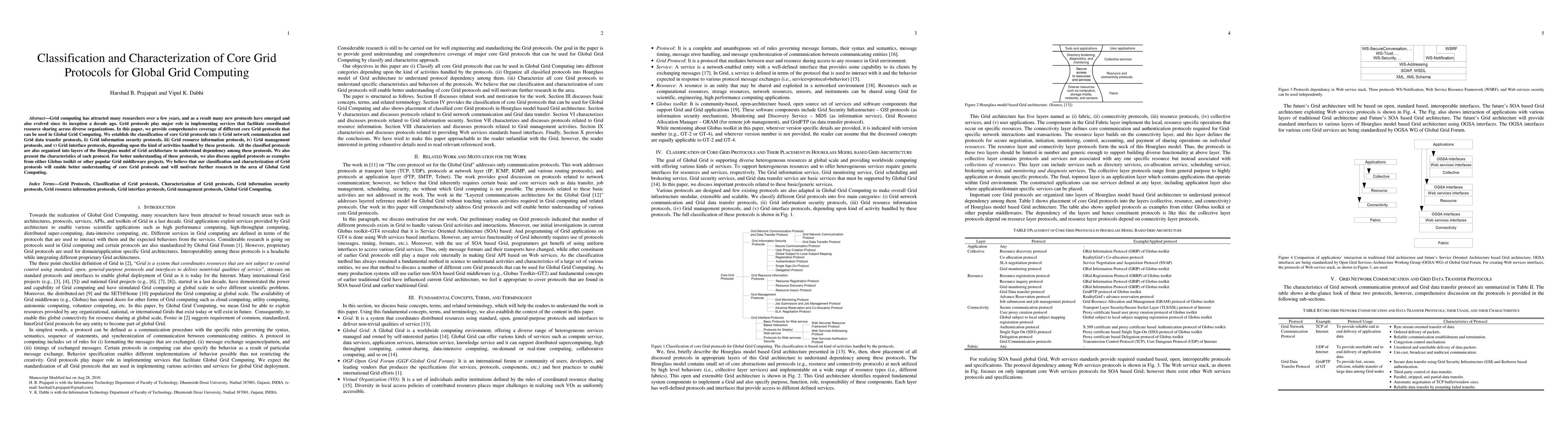 Grid computing has attracted many researchers over a few years, and as a result many new protocols have emerged and also evolved since its inception a decade ago. Grid protocols play major role in implementing services that facilitate coordinated resource sharing across diverse organizations. In this paper, we provide comprehensive coverage of different core Grid protocols that can be used in Global Grid Computing. We establish the classification of core Grid protocols into i) Grid network communication and Grid data transfer protocols, ii) Grid information security protocols, iii) Grid resource information protocols, iv) Grid management protocols, and v) Grid interface protocols, depending upon the kind of activities handled by these protocols. All the classified protocols are also organized into layers of the Hourglass model of Grid architecture to understand dependency among these protocols. We also present the characteristics of each protocol. For better understanding of these protocols, we also discuss applied protocols as examples from either Globus toolkit or other popular Grid middleware projects. We believe that our classification and characterization of Grid protocols will enable better understanding of core Grid protocols and will motivate further research in the area of Global Grid Computing.