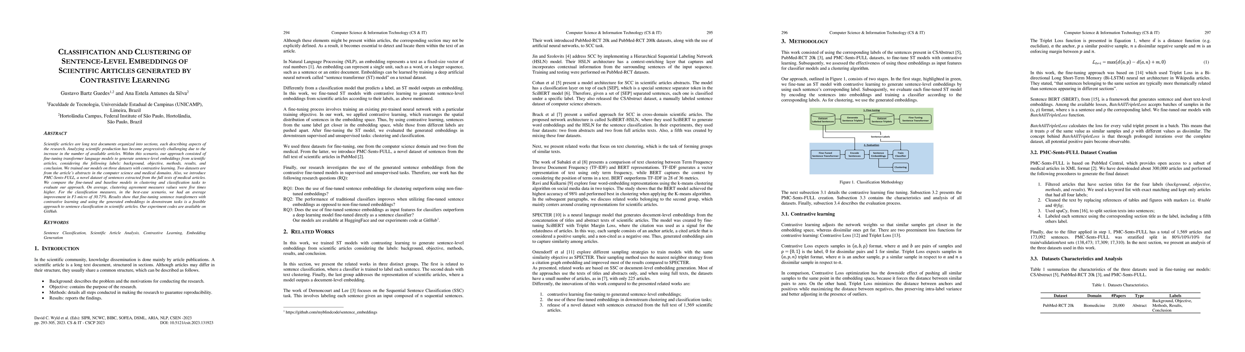 This study fine-tunes transformer models to generate sentence-level embeddings for scientific articles using contrastive learning, achieving significantly better clustering and classification performance for sections like background and results. The approach demonstrates an average 30.73% improvement in F1-micro classification metrics.