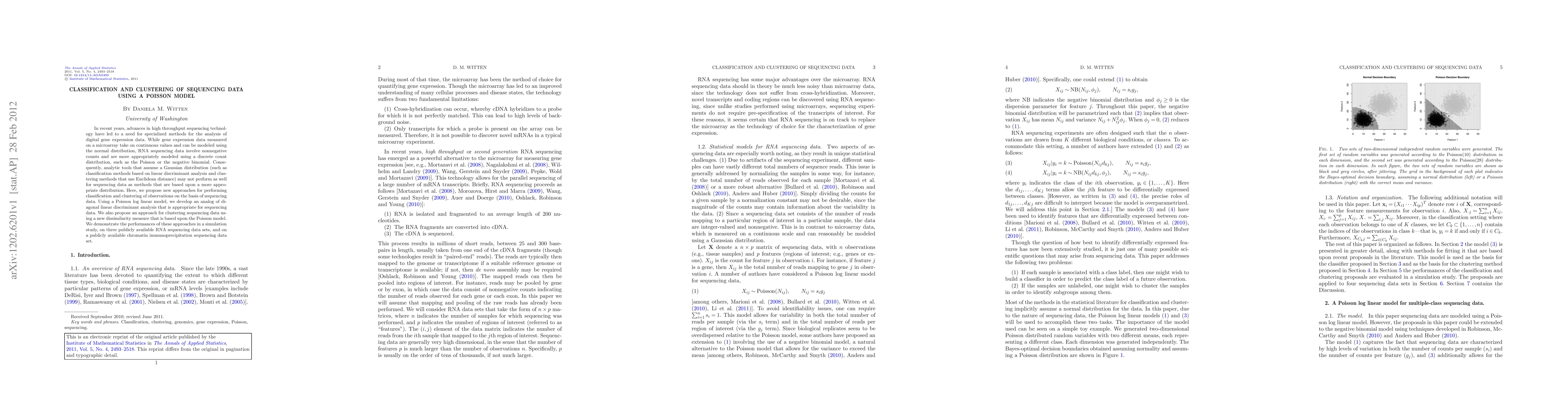 In recent years, advances in high throughput sequencing technology have led to a need for specialized methods for the analysis of digital gene expression data. While gene expression data measured on a microarray take on continuous values and can be modeled using the normal distribution, RNA sequencing data involve nonnegative counts and are more appropriately modeled using a discrete count distribution, such as the Poisson or the negative binomial. Consequently, analytic tools that assume a Gaussian distribution (such as classification methods based on linear discriminant analysis and clustering methods that use Euclidean distance) may not perform as well for sequencing data as methods that are based upon a more appropriate distribution. Here, we propose new approaches for performing classification and clustering of observations on the basis of sequencing data. Using a Poisson log linear model, we develop an analog of diagonal linear discriminant analysis that is appropriate for sequencing data. We also propose an approach for clustering sequencing data using a new dissimilarity measure that is based upon the Poisson model. We demonstrate the performances of these approaches in a simulation study, on three publicly available RNA sequencing data sets, and on a publicly available chromatin immunoprecipitation sequencing data set.