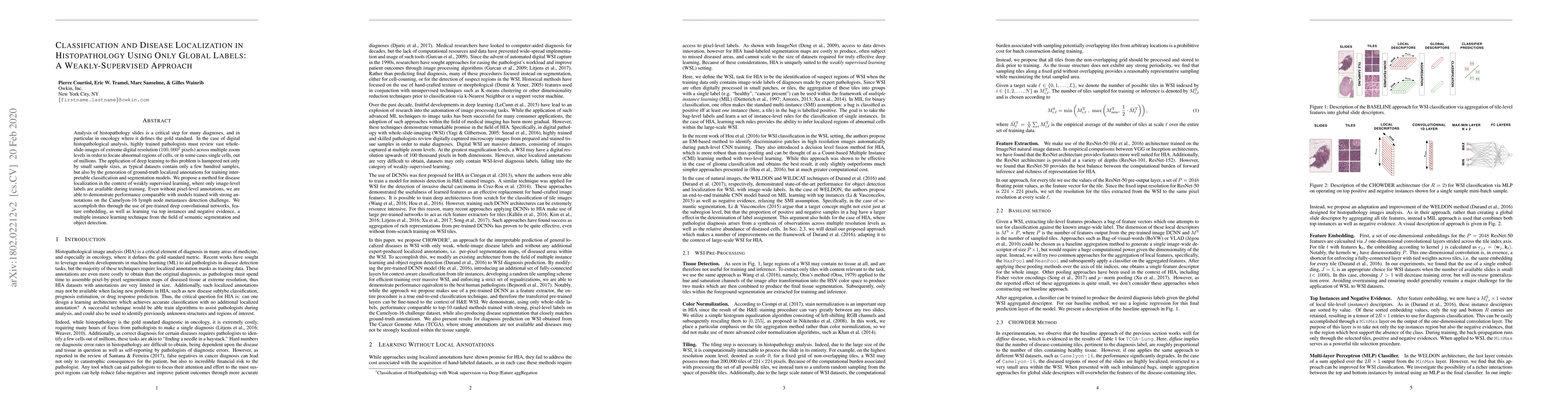 This paper proposes a weakly-supervised deep learning method for histopathology disease localization using only global image-level labels, achieving performance comparable to strongly supervised methods on the Camelyon-16 challenge, leveraging pre-trained networks and multiple instance learning techniques.
