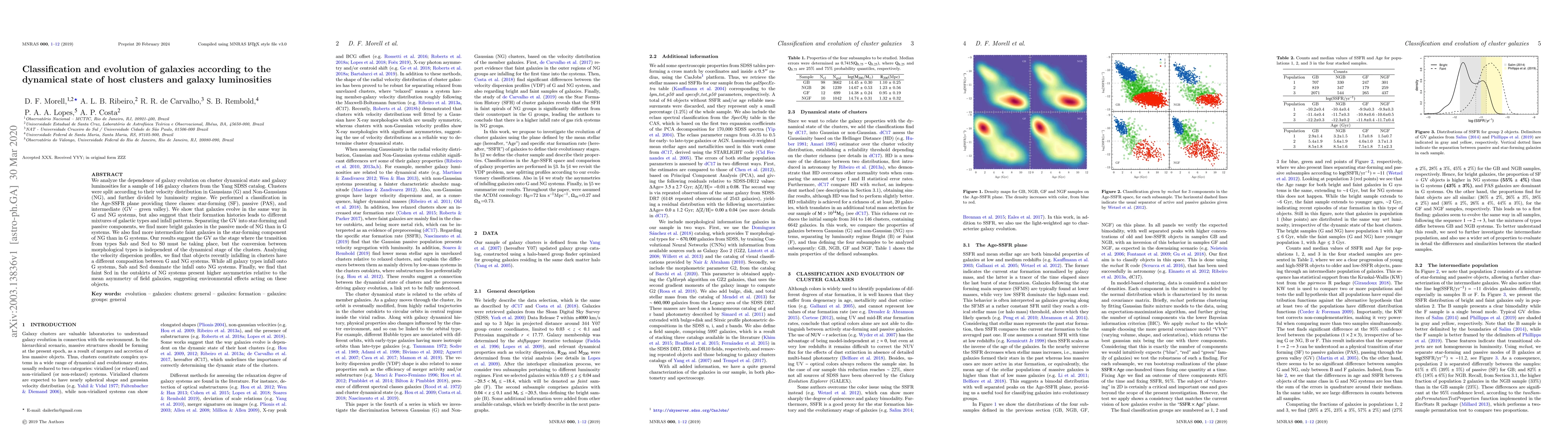 We analyze the dependence of galaxy evolution on cluster dynamical state and galaxy luminosities for a sample of 146 galaxy clusters from the Yang SDSS catalog. Clusters were split according to their velocity distribution in Gaussians (G) and Non-Gaussians (NG), and further divided by luminosity regime. We performed a classification in the Age-SSFR plane providing three classes: star-forming (SF), passive (PAS), and intermediate (GV -- green valley). We show that galaxies evolve in the same way in G and NG systems, but also suggest that their formation histories leads to different mixtures of galactic types and infall patterns. Separating the GV into star-forming and passive components, we find more bright galaxies in the passive mode of NG than in G systems. We also find more intermediate faint galaxies in the star-forming component of NG than in G systems. Our results suggest the GV as the stage where the transition from types Sab and Scd to S0 must be taking place, but the conversion between morphological types is independent of the dynamical stage of the clusters. Analyzing the velocity dispersion profiles, we find that objects recently infalling in clusters have a different composition between G and NG systems. While all galaxy types infall onto G systems, Sab and Scd dominate the infall onto NG systems. Finally, we find that faint Scd in the outskirts of NG systems present higher asymmetries relative to the mean asymmetry of field galaxies, suggesting environmental effects acting on these objects.