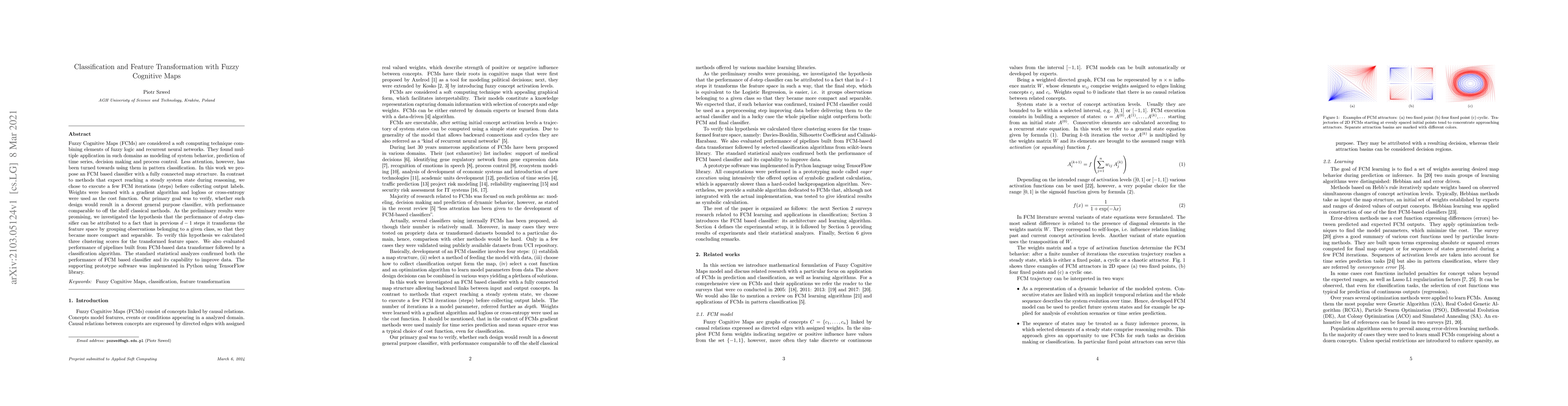 Fuzzy Cognitive Maps (FCMs) are considered a soft computing technique combining elements of fuzzy logic and recurrent neural networks. They found multiple application in such domains as modeling of system behavior, prediction of time series, decision making and process control. Less attention, however, has been turned towards using them in pattern classification. In this work we propose an FCM based classifier with a fully connected map structure. In contrast to methods that expect reaching a steady system state during reasoning, we chose to execute a few FCM iterations (steps) before collecting output labels. Weights were learned with a gradient algorithm and logloss or cross-entropy were used as the cost function. Our primary goal was to verify, whether such design would result in a descent general purpose classifier, with performance comparable to off the shelf classical methods. As the preliminary results were promising, we investigated the hypothesis that the performance of $d$-step classifier can be attributed to a fact that in previous $d-1$ steps it transforms the feature space by grouping observations belonging to a given class, so that they became more compact and separable. To verify this hypothesis we calculated three clustering scores for the transformed feature space. We also evaluated performance of pipelines built from FCM-based data transformer followed by a classification algorithm. The standard statistical analyzes confirmed both the performance of FCM based classifier and its capability to improve data. The supporting prototype software was implemented in Python using TensorFlow library.