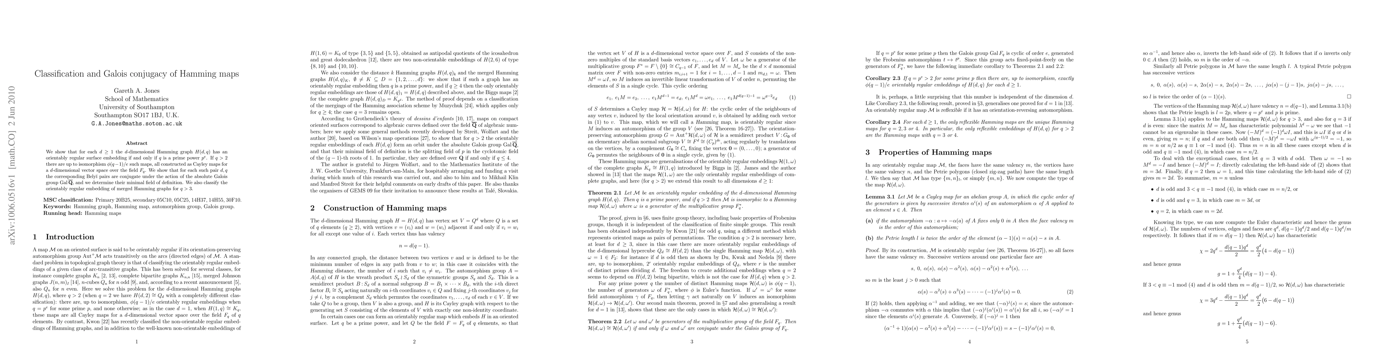 We show that for each d>0 the d-dimensional Hamming graph H(d,q) has an orientably regular surface embedding if and only if q is a prime power p^e. If q>2 there are up to isomorphism \phi(q-1)/e such maps, all constructed as Cayley maps for a d-dimensional vector space over the field of order q. We show that for each such pair d, q the corresponding Belyi pairs are conjugate under the action of the absolute Galois group, and we determine their minimal field of definition. We also classify the orientably regular embedding of merged Hamming graphs for q>3.
