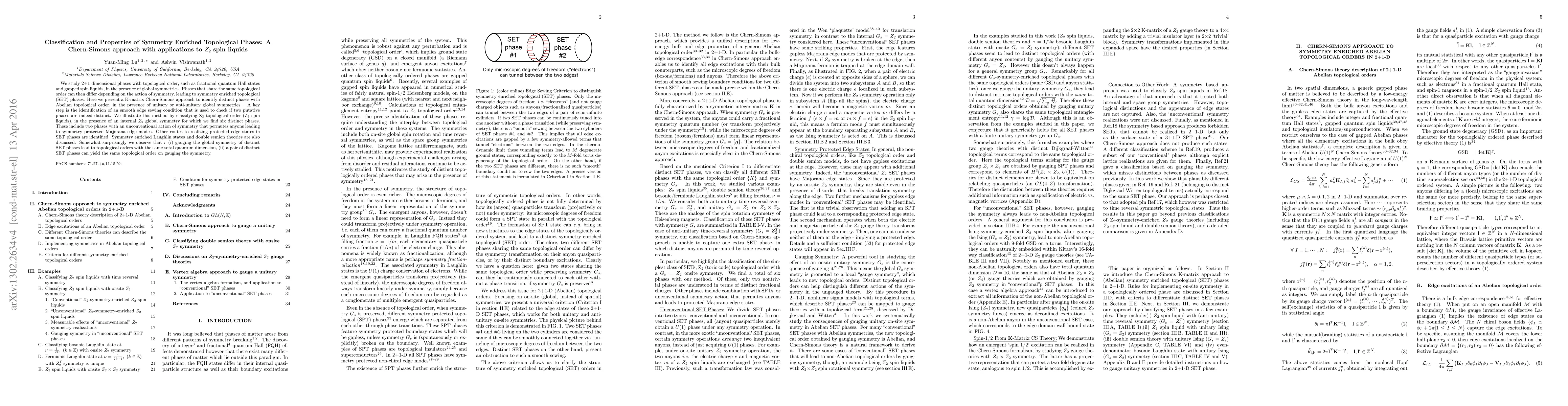 This paper introduces a Chern-Simons approach to classify symmetry enriched topological (SET) phases in 2+1 dimensions, particularly focusing on $Z_2$ spin liquids under $Z_2$ symmetry. It identifies six distinct SET phases, including symmetry protected topological phases and Majorana edge modes, demonstrating that gauging symmetry results in different topological orders with identical quantum dimensions.