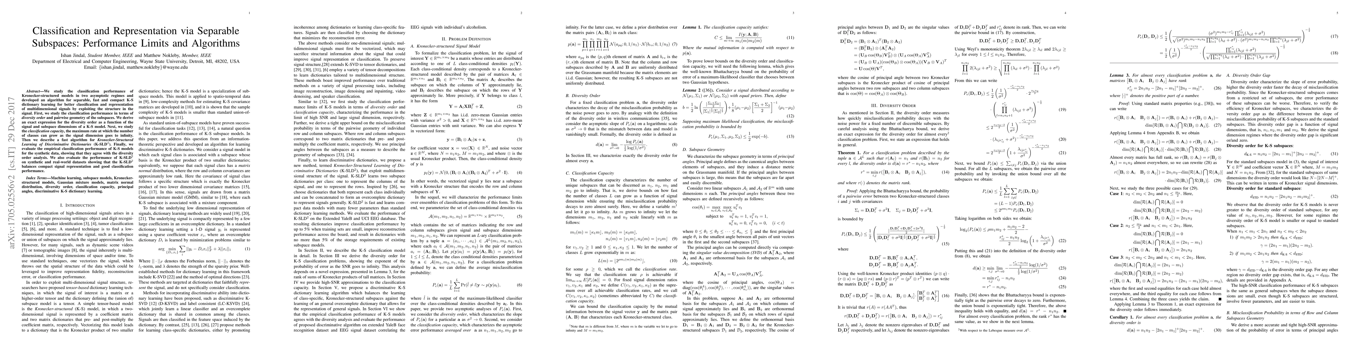 We study the classification performance of Kronecker-structured models in two asymptotic regimes and developed an algorithm for separable, fast and compact K-S dictionary learning for better classification and representation of multidimensional signals by exploiting the structure in the signal. First, we study the classification performance in terms of diversity order and pairwise geometry of the subspaces. We derive an exact expression for the diversity order as a function of the signal and subspace dimensions of a K-S model. Next, we study the classification capacity, the maximum rate at which the number of classes can grow as the signal dimension goes to infinity. Then we describe a fast algorithm for Kronecker-Structured Learning of Discriminative Dictionaries (K-SLD2). Finally, we evaluate the empirical classification performance of K-S models for the synthetic data, showing that they agree with the diversity order analysis. We also evaluate the performance of K-SLD2 on synthetic and real-world datasets showing that the K-SLD2 balances compact signal representation and good classification performance.