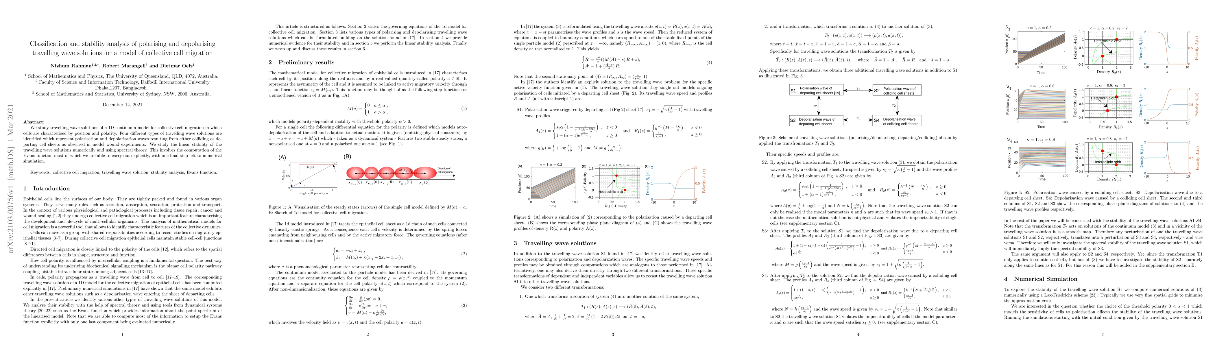 This paper classifies four types of travelling wave solutions in a 1D model for collective cell migration, representing polarisation and depolarisation waves. It employs numerical and spectral methods, including the Evans function, to analyse the linear stability of these solutions.
