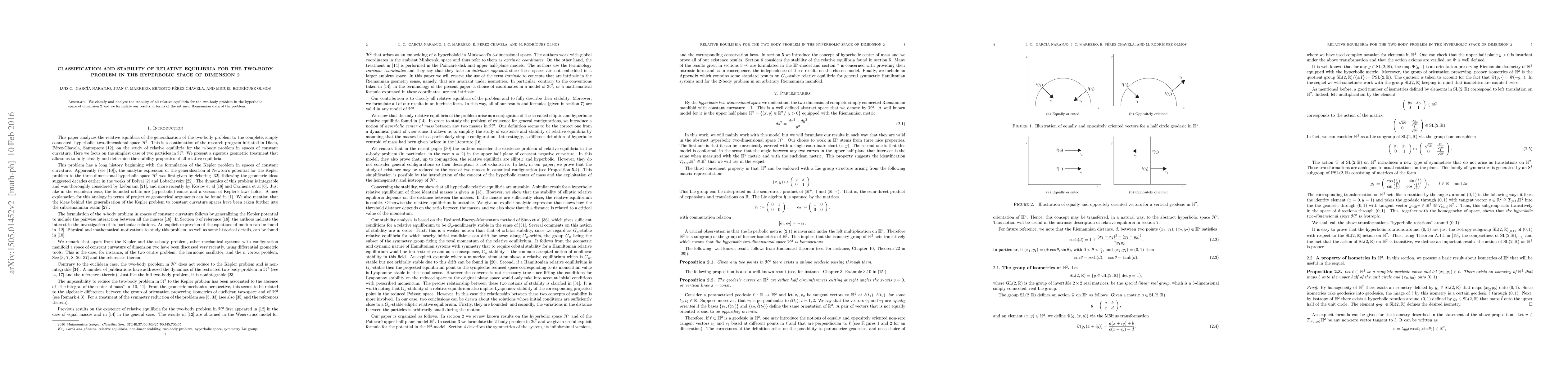 We classify and analyze the stability of all relative equilibria for the two-body problem in the hyperbolic space of dimension 2 and we formulate our results in terms of the intrinsic Riemannian data of the problem.