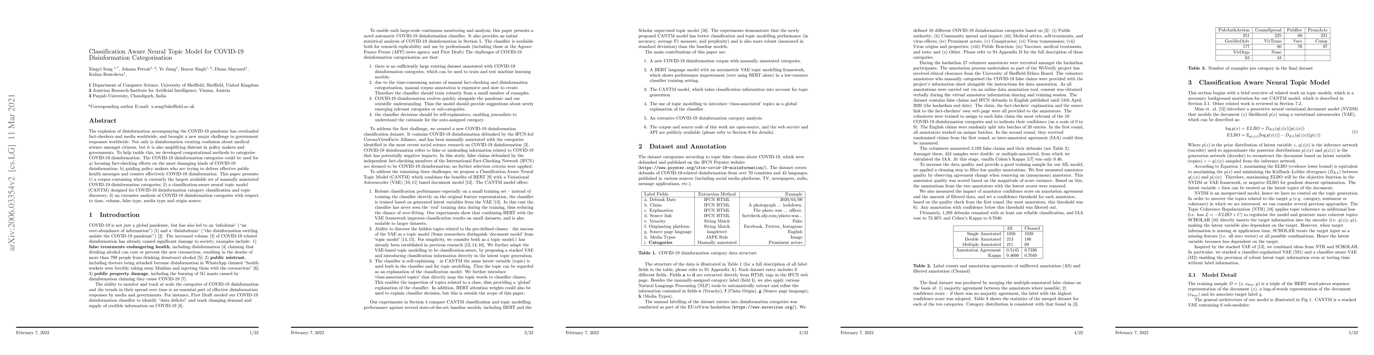 This paper introduces a new corpus of manually annotated COVID-19 disinformation categorized for fact-checking and policy guidance, alongside a classification-aware neural topic model (CANTM) for disinformation categorization and topic discovery, followed by an analysis of the disinformation across various dimensions.