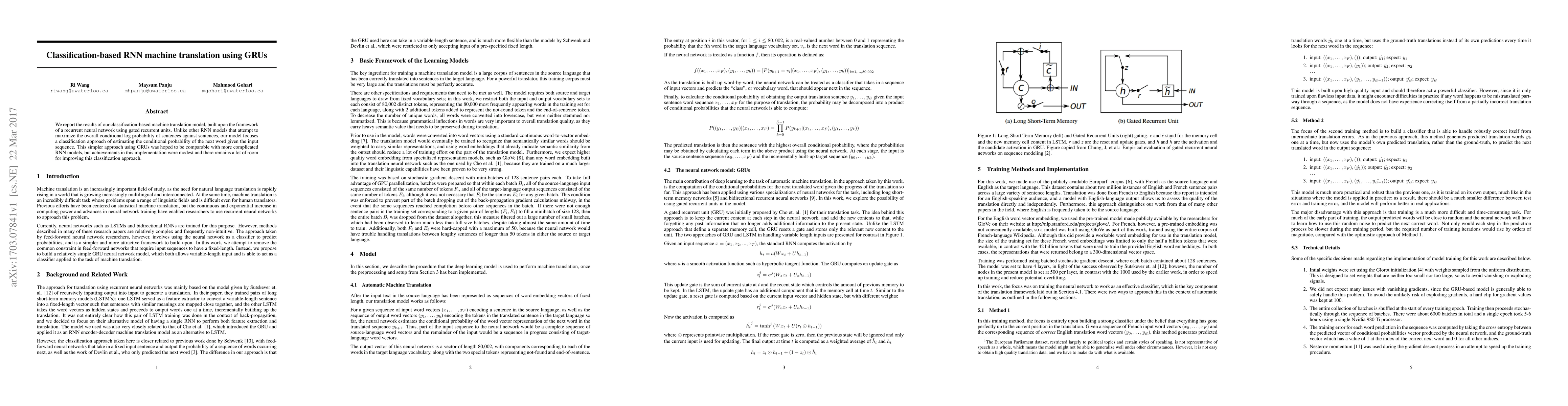 This paper presents a classification-based machine translation model using gated recurrent units (GRUs) in an RNN framework, focusing on estimating the conditional probability of the next word. Despite its simplicity, the model's performance was modest compared to more complex RNN models, indicating potential for future improvements.