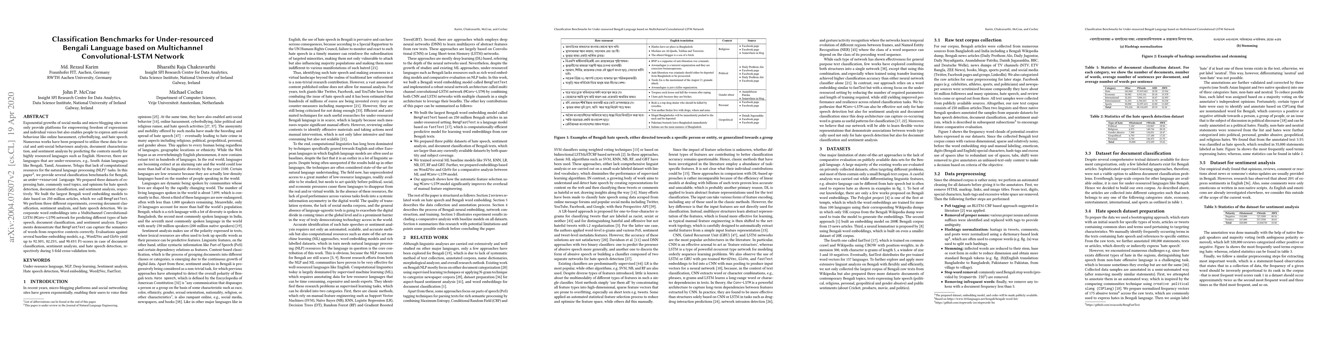 This paper develops classification benchmarks for the under-resourced Bengali language using a Multichannel Convolutional-LSTM network. It introduces three datasets for hate speech detection, document classification, and sentiment analysis, and presents BengFastText, the largest Bengali word embedding model to date, achieving superior F1-scores of 92.30%, 82.25%, and 90.45% in respective tasks.