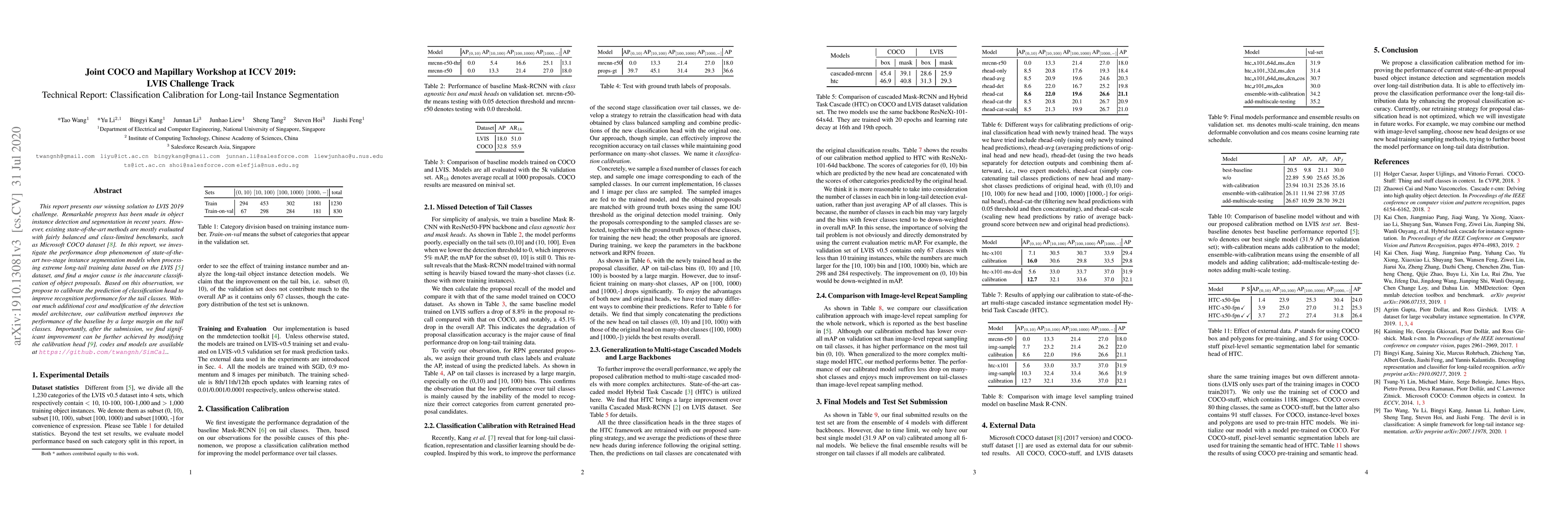 Remarkable progress has been made in object instance detection and segmentation in recent years. However, existing state-of-the-art methods are mostly evaluated with fairly balanced and class-limited benchmarks, such as Microsoft COCO dataset [8]. In this report, we investigate the performance drop phenomenon of state-of-the-art two-stage instance segmentation models when processing extreme long-tail training data based on the LVIS [5] dataset, and find a major cause is the inaccurate classification of object proposals. Based on this observation, we propose to calibrate the prediction of classification head to improve recognition performance for the tail classes. Without much additional cost and modification of the detection model architecture, our calibration method improves the performance of the baseline by a large margin on the tail classes. Codes will be available. Importantly, after the submission, we find significant improvement can be further achieved by modifying the calibration head, which we will update later.