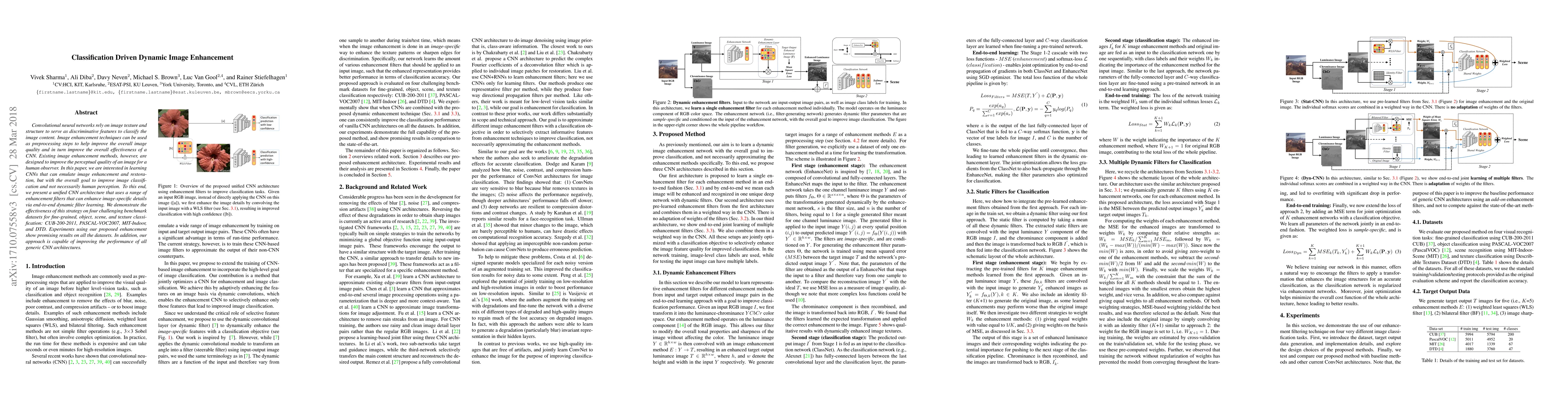 This research introduces a novel CNN architecture designed to dynamically enhance images specifically to improve the classification performance of convolutional neural networks, rather than focusing on human perception. The proposed method employs a range of enhancement filters learned end-to-end to refine image-specific details, demonstrating significant improvements across multiple fine-grained, object, scene, and texture classification datasets.
