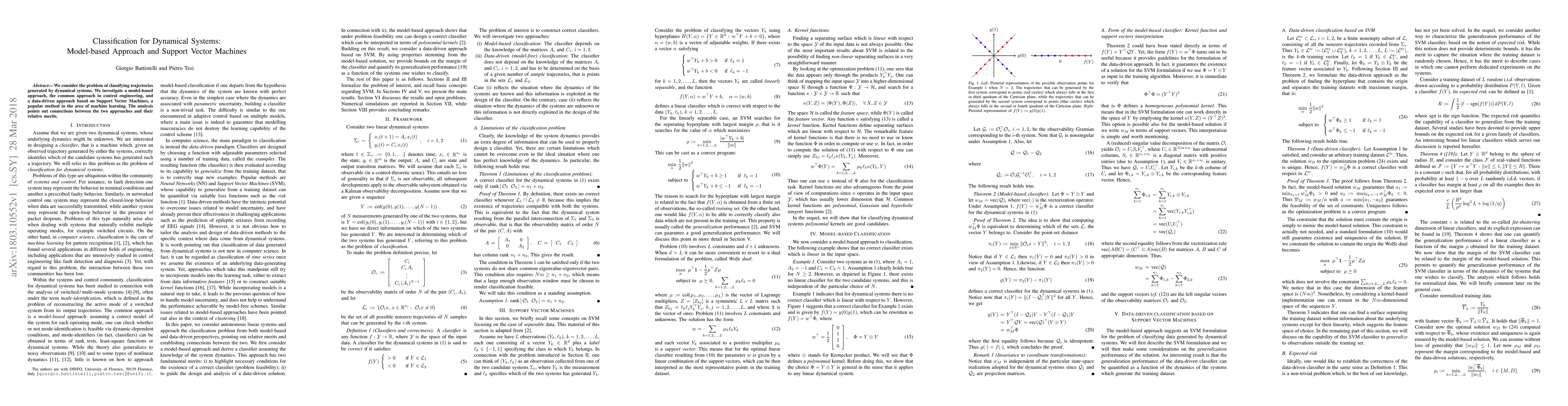 This paper explores the classification of dynamical system trajectories using both a model-based approach and a data-driven Support Vector Machine method, highlighting the connections and respective advantages of each technique.