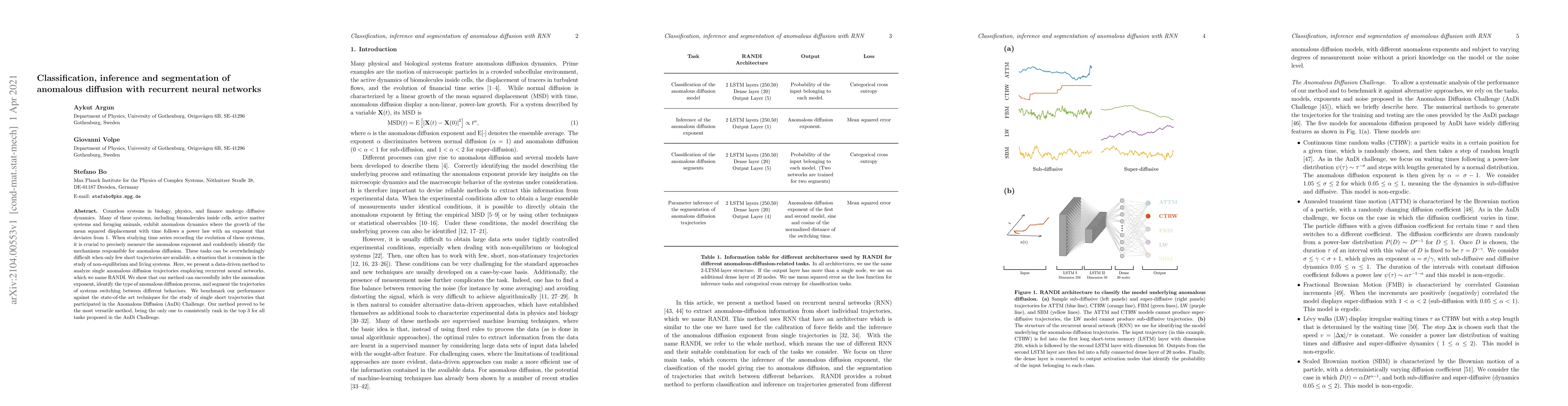 This paper introduces RANDI, a recurrent neural network method for analyzing anomalous diffusion in systems like biomolecules and active matter. It successfully infers the anomalous exponent, identifies diffusion types, and segments trajectory behaviors, outperforming other techniques in the Anomalous Diffusion Challenge.