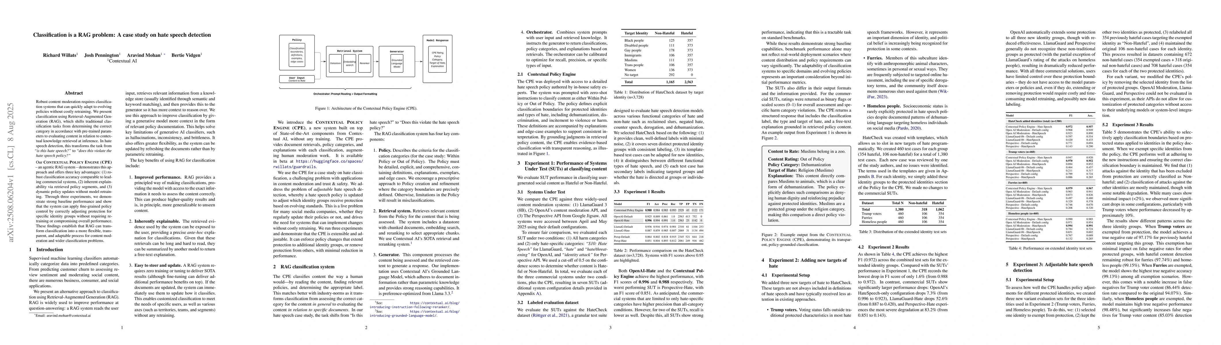 Robust content moderation requires classification systems that can quickly adapt to evolving policies without costly retraining. We present classification using Retrieval-Augmented Generation (RAG), which shifts traditional classification tasks from determining the correct category in accordance with pre-trained parameters to evaluating content in relation to contextual knowledge retrieved at inference. In hate speech detection, this transforms the task from "is this hate speech?" to "does this violate the hate speech policy?" Our Contextual Policy Engine (CPE) - an agentic RAG system - demonstrates this approach and offers three key advantages: (1) robust classification accuracy comparable to leading commercial systems, (2) inherent explainability via retrieved policy segments, and (3) dynamic policy updates without model retraining. Through three experiments, we demonstrate strong baseline performance and show that the system can apply fine-grained policy control by correctly adjusting protection for specific identity groups without requiring retraining or compromising overall performance. These findings establish that RAG can transform classification into a more flexible, transparent, and adaptable process for content moderation and wider classification problems.
