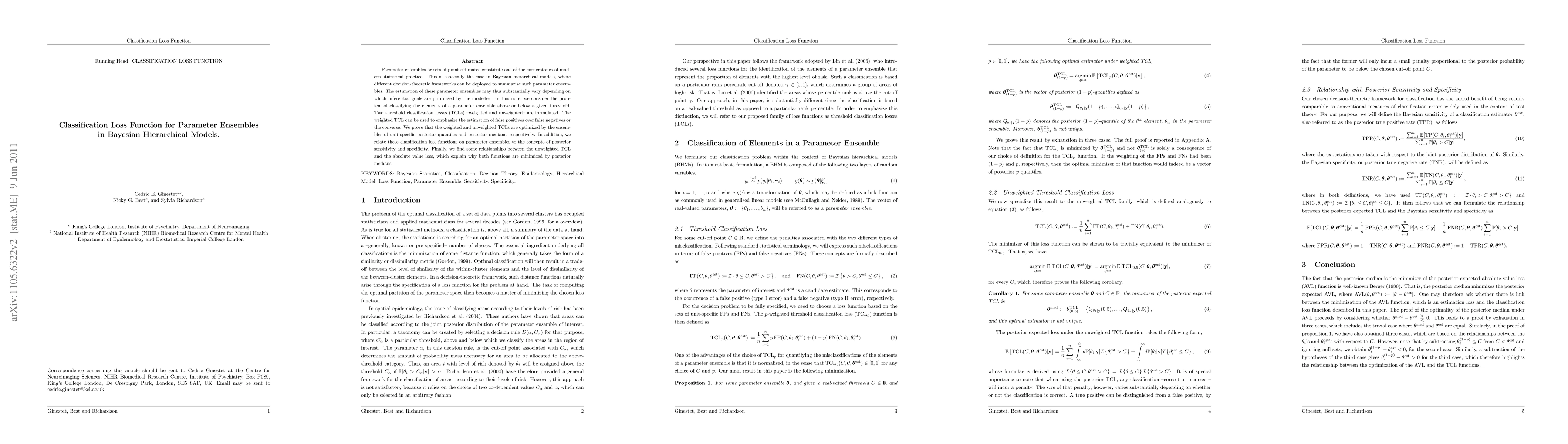 Researchers developed classification loss functions for Bayesian hierarchical models to classify parameter ensembles above or below a threshold. These functions can optimize estimation of false positives or negatives, and relate to concepts like posterior sensitivity and specificity.