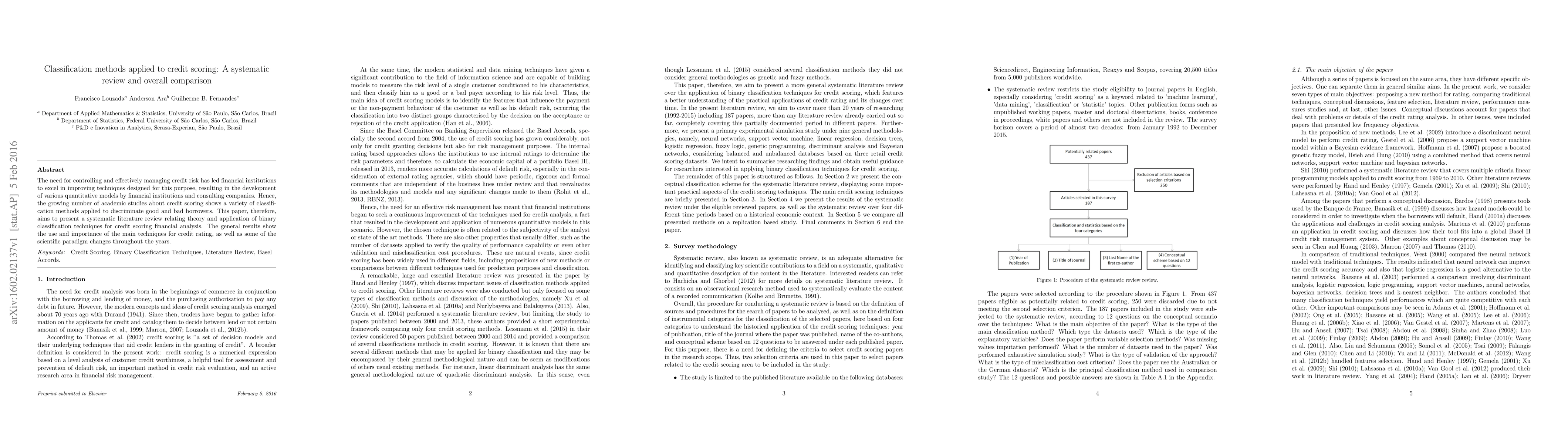 The need for controlling and effectively managing credit risk has led financial institutions to excel in improving techniques designed for this purpose, resulting in the development of various quantitative models by financial institutions and consulting companies. Hence, the growing number of academic studies about credit scoring shows a variety of classification methods applied to discriminate good and bad borrowers. This paper, therefore, aims to present a systematic literature review relating theory and application of binary classification techniques for credit scoring financial analysis. The general results show the use and importance of the main techniques for credit rating, as well as some of the scientific paradigm changes throughout the years.
