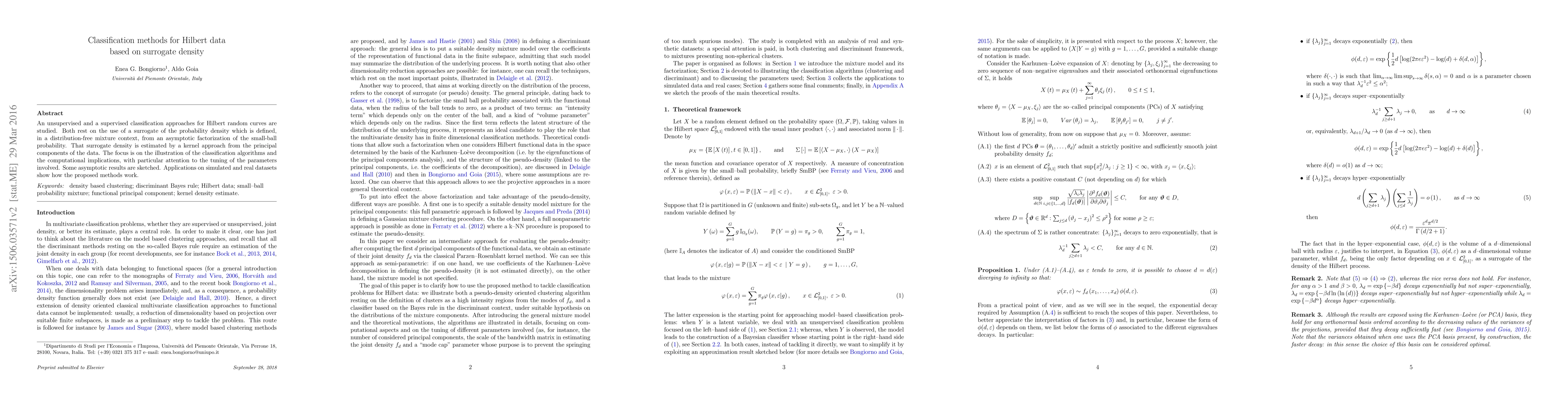 This paper introduces two classification methods for Hilbert data based on a surrogate density estimated from principal components of the data. It demonstrates the computational implications and applicability to simulated and real datasets.