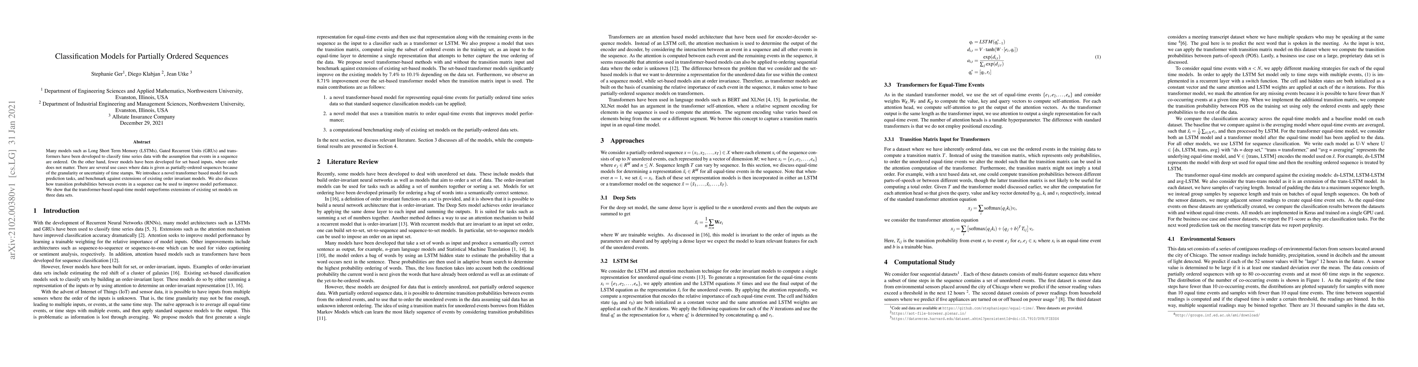 Many models such as Long Short Term Memory (LSTMs), Gated Recurrent Units (GRUs) and transformers have been developed to classify time series data with the assumption that events in a sequence are ordered. On the other hand, fewer models have been developed for set based inputs, where order does not matter. There are several use cases where data is given as partially-ordered sequences because of the granularity or uncertainty of time stamps. We introduce a novel transformer based model for such prediction tasks, and benchmark against extensions of existing order invariant models. We also discuss how transition probabilities between events in a sequence can be used to improve model performance. We show that the transformer-based equal-time model outperforms extensions of existing set models on three data sets.