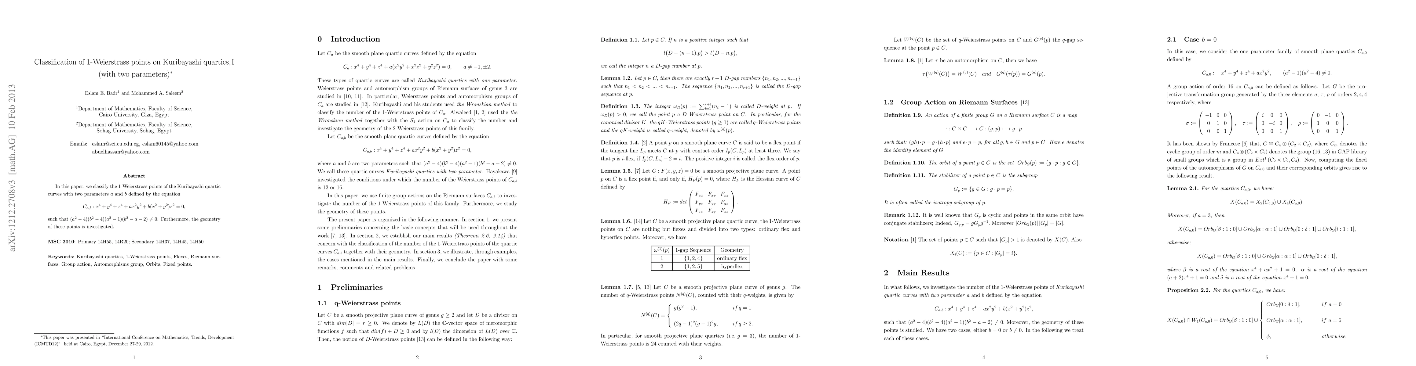 This paper classifies 1-Weierstrass points on Kuribayashi quartics with two parameters $a$ and $b$, exploring their geometry.