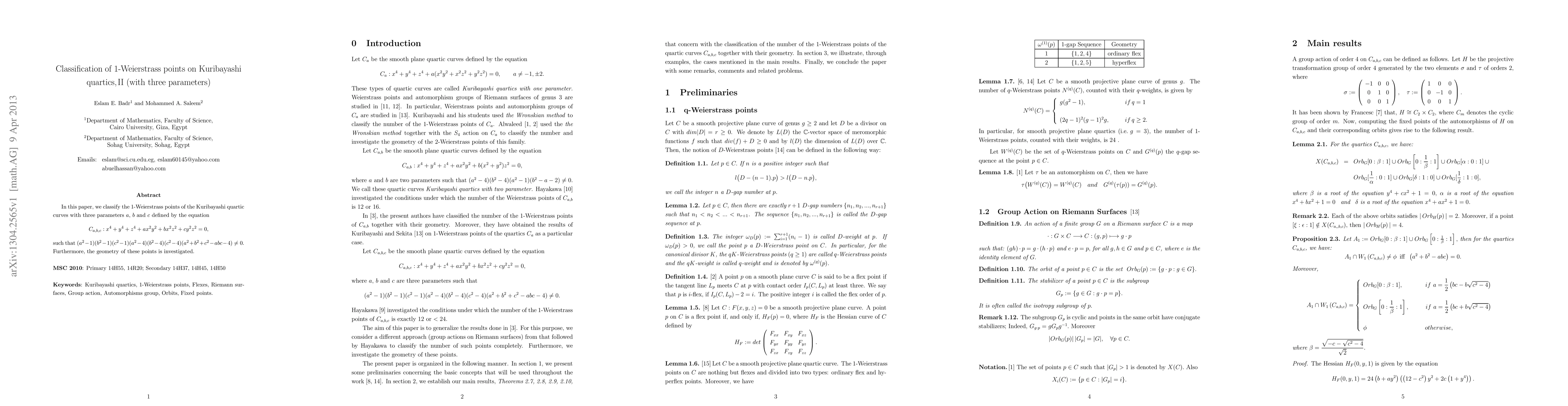 This paper classifies 1-Weierstrass points on Kuribayashi quartic curves with parameters a, b, and c, under the condition (a^2-1)(b^2-1)(c^2-1)(a^2-4)(b^2-4)(c^2-4)(a^2+b^2+c^2-abc-4)≠0. The research examines the geometric aspects of these classified points.