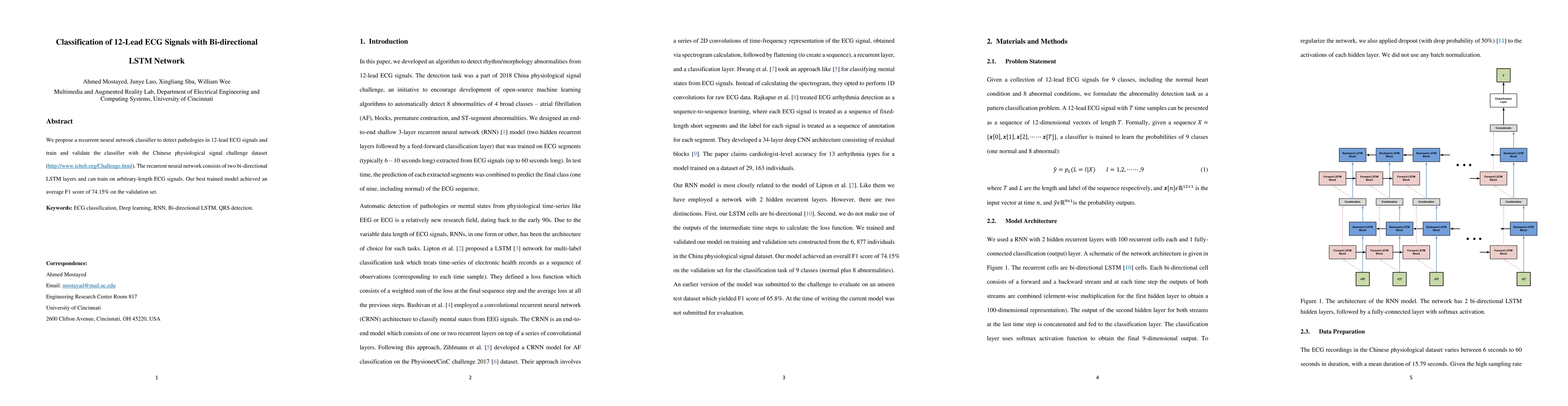 We propose a recurrent neural network classifier to detect pathologies in 12-lead ECG signals and train and validate the classifier with the Chinese physiological signal challenge dataset (http://www.icbeb.org/Challenge.html). The recurrent neural network consists of two bi-directional LSTM layers and can train on arbitrary-length ECG signals. Our best trained model achieved an average F1 score of 74.15% on the validation set. Keywords: ECG classification, Deep learning, RNN, Bi-directional LSTM, QRS detection.