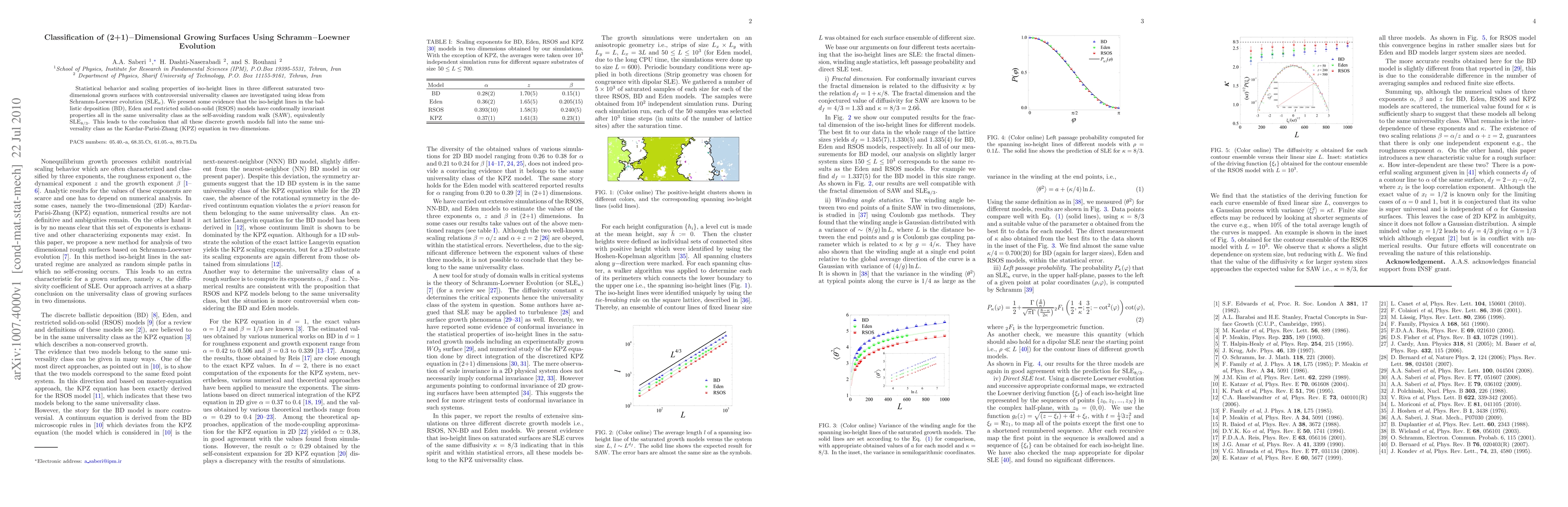 Statistical behavior and scaling properties of iso-height lines in three different saturated two-dimensional grown surfaces with controversial universality classes are investigated using ideas from Schramm-Loewner evolution (SLE$_\kappa$). We present some evidence that the iso-height lines in the ballistic deposition (BD), Eden and restricted solid-on-solid (RSOS) models have conformally invariant properties all in the same universality class as the self-avoiding random walk (SAW), equivalently SLE$_{8/3}$. This leads to the conclusion that all these discrete growth models fall into the same universality class as the Kardar-Parisi-Zhang (KPZ) equation in two dimensions.